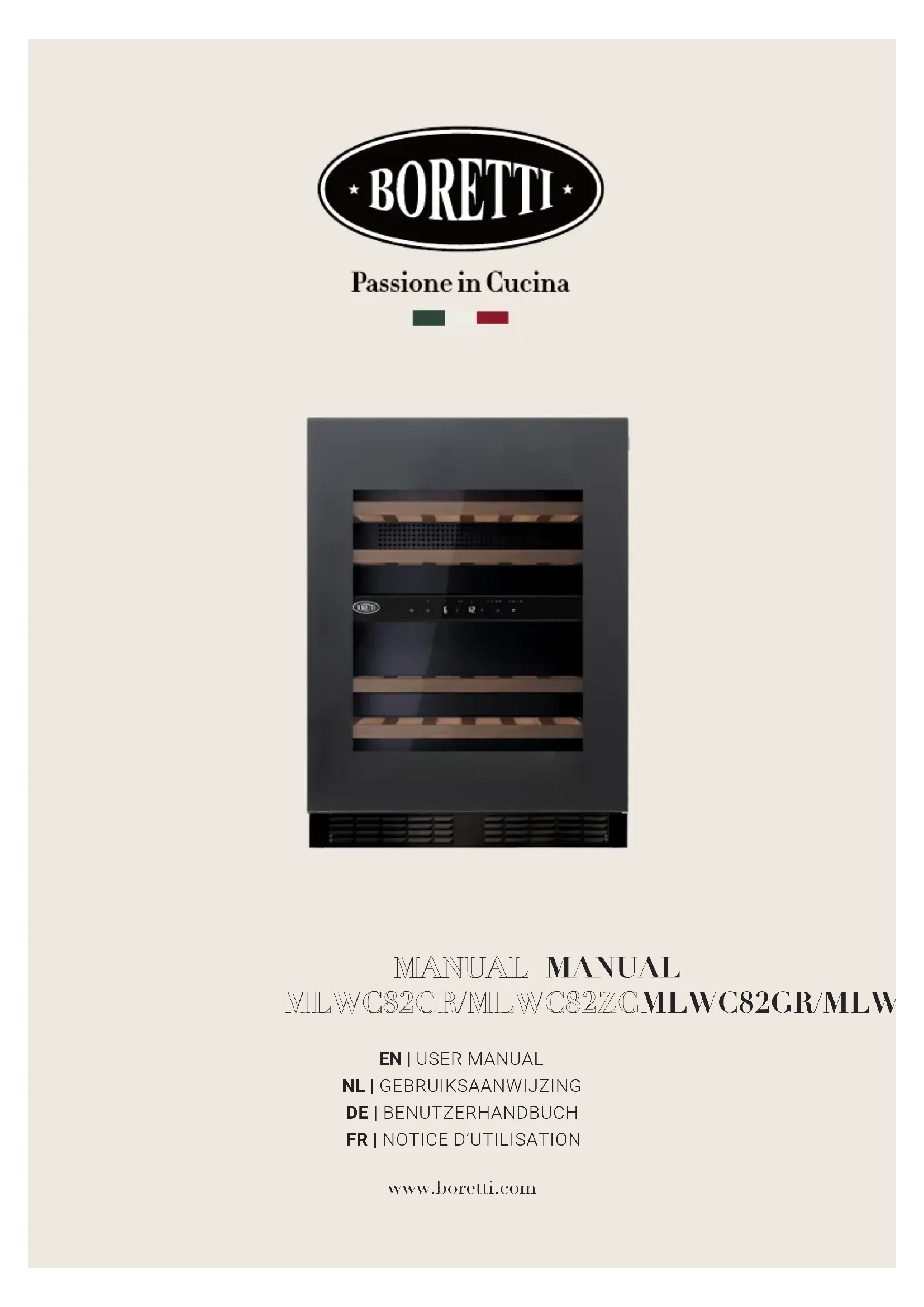 www.boretti.com83 Introduction Félicitations ! Vous êtes le propriétaire officiel d'une cave à vin Boretti. Au cours des années à venir vous découvrirez que l'utilisation d'une cave à vin Boretti donne une nouvelle dimension au rafraîchissement. Nous vous conseillons de lire attentivement ce manuel avant de mettre la cave en service, de façon à connaître ce magnifique appareil en détail. Pour toute question, veuillez nous contacter. Nous serions ravis de vous accueillir dans notre Centre de l'Expérience à tout moment, pour vous inspirer et répondre à vosquestions. Nous vous souhaitons beaucoup de plaisir avec votre rafraîchissement ! Faites de vos apéritifs et de vos dîners des moments inoubliables ! Boretti Enregistrement du produit Pour enregistrer votre achat, veuillez remplir le formulaire d'inscription en ligne à www.boretti.com. FRCaves à vin Boretti/Guide de l'utilisateur - Conseils d'installation MANUEL MANUEL MLWC82ZG/MLWC82GRMLWC82ZG/MLWC82GR