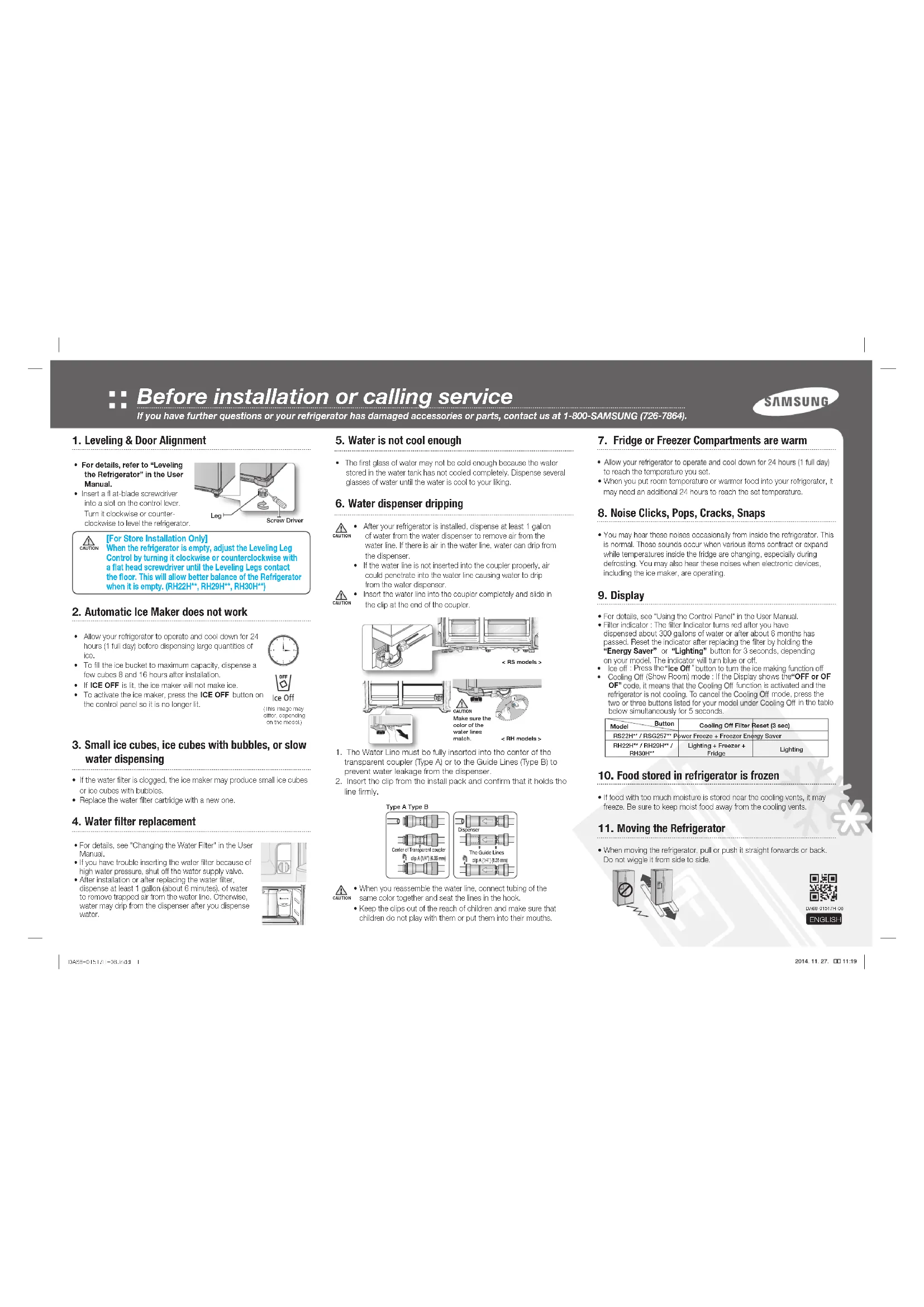 - Lors du déplacement du réfrigérateur, tirez-le et poussez-le directement vers l'avant ou vers l'arrière. Ne le basculez pas d'un côté à l'autre. Avant l’installation ou avant de contacter le service de réparation Si vous avez des questions ou si des pièces du réfrigérateur sont endommagées, contactez-nous au 1 800 SAMSUNG (726-7864). FRANÇAIS