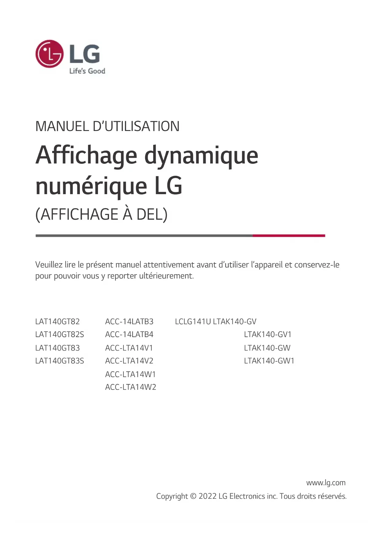 Affichage dynamique numérique LG (AFFICHAGE À DEL) Veuillez lire le présent manuel attentivement avant d’utiliser l’appareil et conservez-le pour pouvoir vous y reporter ultérieurement. www.lg.com Copyright © 2022 LG Electronics inc. Tous droits réservés. LAT140GT82