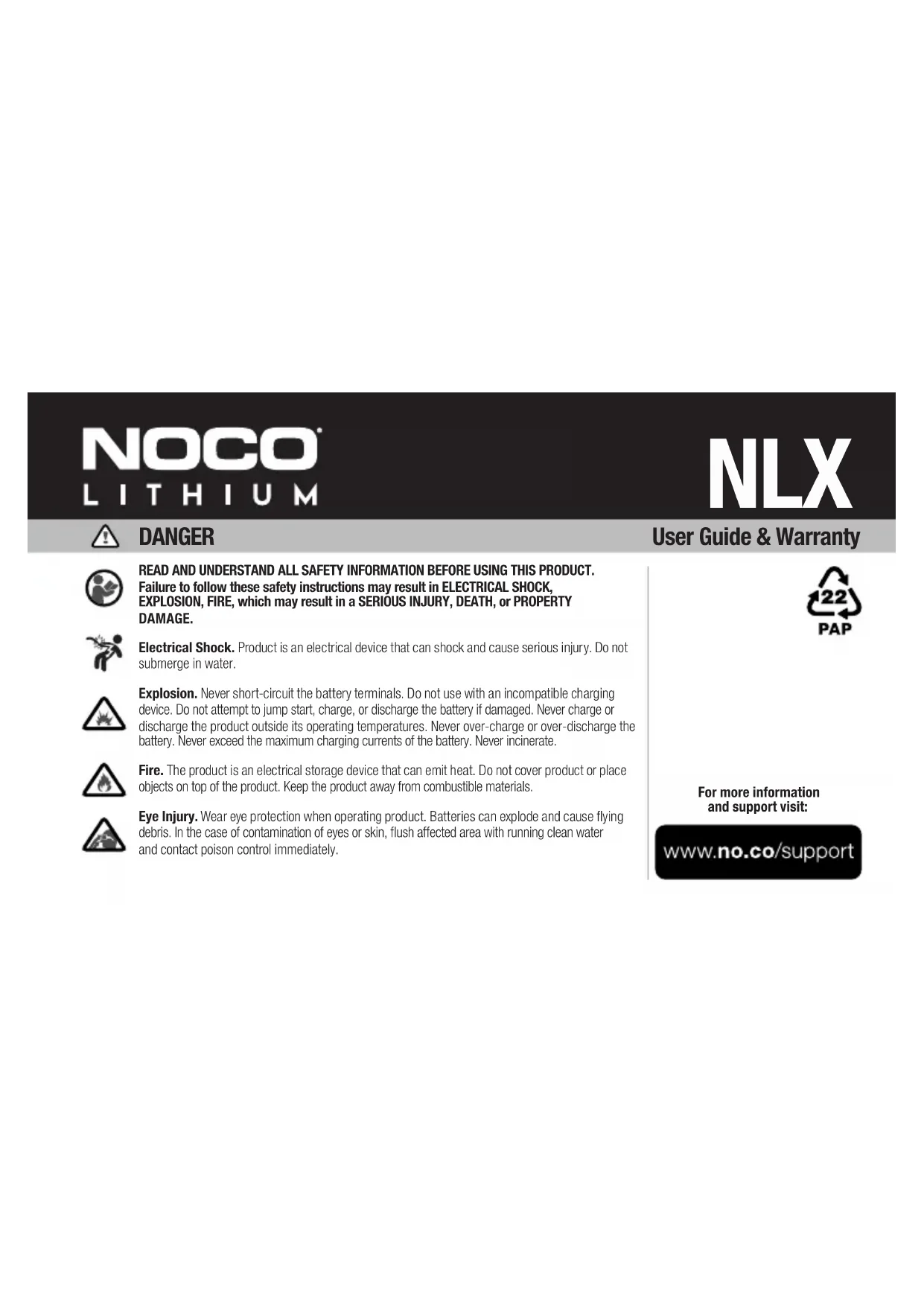 THIS WARRANTY GIVES YOU SPECIFIC LEGAL RIGHTS, AND YOU MAY HAVE OTHER RIGHTS THAT VARY FROM STATE, COUNTRY, OR PROVINCE. OTHER THAN AS PERMITTED BY LAW, NOCO DOES NOT EXCLUDE, LIMIT OR SUSPEND OTHER RIGHTS YOU MAY HAVE, INCLUDING THOSE THAT MAY ARISE FROM THE NONCONFORMITY OF A SALES CONTRACT. FOR A FULL UNDERSTANDING OF YOUR RIGHTS, YOU SHOULD CONSULT THE LAWS OF YOUR STATE, COUNTRY, OR PROVINCE. TO THE EXTENT PERMITTED BY LAW, THIS WARRANTY AND THE REMEDIES SET FORTH ARE EXCLUSIVE AND IN LIEU OF ALL OTHER WARRANTIES, REMEDIES, AND CONDITIONS, WHETHER ORAL, WRITTEN, STATUTORY, EXPRESS, OR IMPLIED. NOCO DISCLAIMS ALL STATUTORY AND IMPLIED WARRANTIES, INCLUDING, WITHOUT LIMITATION, WARRANTIES OF MERCHANTABILITY AND FITNESS FOR A PARTICULAR PURPOSE AND WARRANTIES AGAINST HIDDEN OR LATENT DEFECTS, TO THE EXTENT PERMITTED BY LAW. IN SO FAR AS SUCH WARRANTIES CANNOT BE DISCLAIMED, NOCO LIMITS THE DURATION AND REMEDIES OF SUCH WARRANTIES TO THE DURATION OF THIS EXPRESS WARRANTY AND, AT NOCO'S OPTION, THE REPAIR OR REPLACEMENT OF PRODUCTS DESCRIBED BELOW. SOME STATES, COUNTRIES, AND PROVINCES DO NOT ALLOW LIMITATIONS ON HOW LONG AN IMPLIED WARRANTY - OR CONDITION - MAY LAST, SO THE LIMITATION DESCRIBED ABOVE MAY NOT APPLY TO YOU. NOCO warrants the NOCO-branded Products contained in the original packaging (NOCO Product) against defects in materials and workmanship when used normally in accordance with NOCO's published guidelines for a period of FIVE (5) YEARS from the date of original retail purchase or delivery date by the end-user purchaser (Warranty Period). NOCO's published guidelines include but are not limited to, the information contained in this Warranty, technical specifications, and user manuals. IN SOME STATES, COUNTRIES, OR PROVINCES, NATIONAL LAW MAY PROVIDE MORE EXTENDED WARRANTY PERIODS. As such, the benefits of the Limited Warranty are intended to supplement, and not replace, the rights provided by consumer protection laws. NOCO'S LIABILITY IS LIMITED TO REPLACEMENT OR REPAIR. NOCO SHALL NOT BE LIABLE FOR ANY SPECIAL, INCIDENTAL, CONSEQUENTIAL, OR EXEMPLARY DAMAGES RESULTING FROM ANY BREACH OF WARRANTY OR CONDITION OR UNDER ANY OTHER LEGAL THEORY, INCLUDING, BUT NOT LIMITED TO, LOST PROFITS, LOST REVENUE, LOST BUSINESS, PROPERTY DAMAGE, PERSONAL INJURY, OR ANY INDIRECT OR CONSEQUENTIAL LOSS OR DAMAGE HOWSOEVER. This Warranty is non-transferable and does not cover return packaging and transportation costs. This Warranty does not apply: (a) to damage caused by accident, abuse, misuse, fire, liquid contact, or other external cause, (b) mishandling, improper installation, modifications, disassembly, or attempted unauthorized repair, (c) cosmetic damage - such as dents or scratches - that doesn't aect the functionality of the Product, (d) to damage caused by operating the Product outside NOCO's published guidelines, (e) to defects caused by normal wear and tear or otherwise due to the normal aging of the Product, or (f) if any serial number has been removed or defaced from the Product. If, during the Warranty Period, you submit a claim, NOCO will, at its option: (a) repair the Product that has been tested and passed our functional requirements, (b) replace the Product with a replacement product of the same model (or with your consent a product that has the same or substantially similar features as the original Product – e.g., a dierent model with the same features), that is new or like-new and has been tested and passed our functional requirements, or (c) exchange the Product for a refund of your purchase price. We require certain information, including proof of purchase, to process Limited Warranty claims. To make a claim under the Limited Warranty, please get in touch with NOCO Support at: (Web) (Email) (US/CA/MX) https://no.co/support support@no.co +1.800.456.6626 (UK) (EU) (AU) (JP) +44 20 4520 7738 +31 20 214 0047 +61 2 4062 0068 +81 3 6893 3017 Guide d’utilisation et garantie LISEZ ATTENTIVEMENT TOUTES LES CONSIGNES DE SÉCURITÉ AVANT D’UTILISER CE PRODUIT. La non-application des consignes de sécurité peut résulter en UN CHOC ÉLECTRIQUE, UNE EXPLOSION, DU FEU, ce qui peut conduire à de GRAVES BLESSURES, LA MORT ou des DÉGÂTS MATÉRIELS. Choc électrique. Le produit est un appareil électrique qui peut causer des chocs et des blessures graves. Ne pas immerger. Explosion. Ne court-circuitez jamais les bornes de la batterie. Ne pas utiliser avec un dispositif de charge incompatible. N'essayez pas de démarrer, de charger ou de décharger la batterie si elle est endommagée. Ne jamais charger ou décharger le produit en dehors de ses températures de fonctionnement. Ne surchargez ou ne déchargez jamais excessivement la batterie. Ne dépassez jamais les courants de charge maximum de la batterie. Ne jamais incinérer. Feu. Le produit est un dispositif de stockage électrique qui peut émettre de la chaleur. Ne couvrez pas le produit et ne placez pas d'objets sur le produit. Tenez le produit éloigné des matières combustibles. Blessures aux yeux. Utilisez des lunettes de protection lors de l’utilisation du produit. Les batteries peuvent exploser et projeter des débris. Dans la cas de contact avec les yeux ou la peau, rincez abondamment le point de contact avec de l’eau courante propre et contactez immédiatement le centre anti-poison. Pour plus d’informations, rendez-vous sur le site: DANGER FrançaisFR Proposition 65. AVERTISSEMENT: Ce produit peut vous exposer à des agents chimiques, y compris plomb et gaz d'échappement, identifiés par l'État de Californie comme pouvant causer le cancer et des malformations congénitales ou autres eets nocifs sur la reproduction. Pour de plus amples informations, prière de consulter www.P65Warnings.ca.gov. Précautions personnelles. Respectez les consignes d'utilisation du produit. En cas d'urgence, demandez de l'assistance pour utiliser ce produit. Portez une protection oculaire complète et des vêtements de protection 