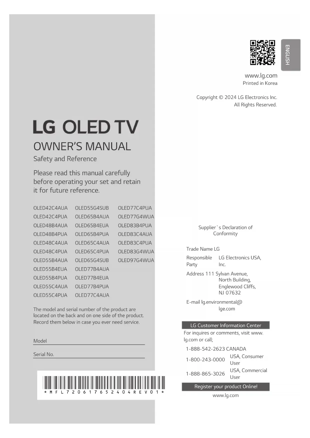Veuillez lire ce manuel attentivement avant d’utiliser votre appareil et conservez-le pour pouvoir vous y reporter ultérieurement. Imprimé en Corée www.lg.com Copyright © 2024 LG Electronics inc. Tous droits réservés. Les numéros de modèle et de série du produit sont situés à l’arrière et sur l’un de ses côtés. Inscrivez-les ci-dessous au cas où vous auriez besoin d’un service d’entretien ou de réparation. Modèle Numéro de série