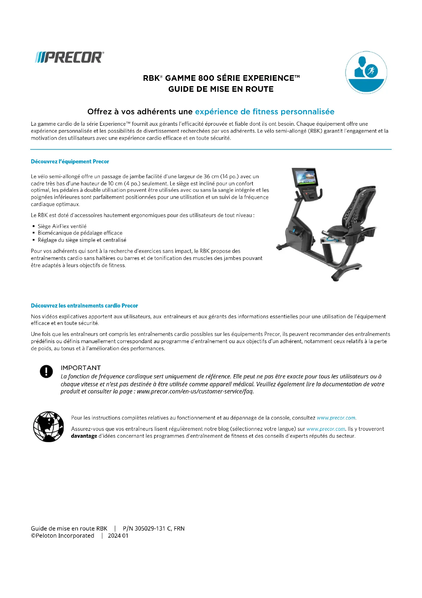 Guide de mise en route RBK | P/N 305029-131 C, FRN ©Peloton Incorporated | 2024 01 Offrez à vos adhérents une expérience de fitness personnalisée La gamme cardio de la série Experience™ fournit aux gérants l’efficacité éprouvée et fiable dont ils ont besoin. Chaque équipement offre une expérience personnalisée et les possibilités de divertissement recherchées par vos adhérents. Le vélo semi-allongé (RBK) garantit l’engagement et la motivation des utilisateurs avec une expérience cardio efficace et en toute sécurité. Découvrez l’équipement Precor Le vélo semi-allongé offre un passage de jambe facilité d’une largeur de 36 cm (14 po.) avec un cadre très bas d’une hauteur de 10 cm (4 po.) seulement. Le siège est incliné pour un confort optimal, les pédales à double utilisation peuvent être utilisées avec ou sans la sangle intégrée et les poignées inférieures sont parfaitement positionnées pour une utilisation et un suivi de la fréquence cardiaque optimaux. Le RBK est doté d'accessoires hautement ergonomiques pour des utilisateurs de tout niveau : Siège AirFlex ventilé Biomécanique de pédalage efficace Réglage du siège simple et centralisé Pour vos adhérents qui sont à la recherche d’exercices sans impact, le RBK propose des entraînements cardio sans haltères ou barres et de tonification des muscles des jambes pouvant être adaptés à leurs objectifs de fitness. Découvrez les entraînements cardio Precor Nos vidéos explicatives apportent aux utilisateurs, aux entraîneurs et aux gérants des informations essentielles pour une utilisation de l’équipement efficace et en toute sécurité. Une fois que les entraîneurs ont compris les entraînements cardio possibles sur les équipements Precor, ils peuvent recommander des entraînements prédéfinis ou définis manuellement correspondant au programme d’entraînement ou aux objectifs d’un adhérent, notamment ceux relatifs à la perte de poids, au tonus et à l’amélioration des performances. Pour les instructions complètes relatives au fonctionnement et au dépannage de la console, consultez www.precor.com. Assurez-vous que vos entraîneurs lisent régulièrement notre blog (sélectionnez votre langue) sur www.precor.com. Ils y trouveront davantage d’idées concernant les programmes d’entraînement de fitness et des conseils d’experts réputés du secteur. IMPORTANT La fonction de fréquence cardiaque sert uniquement de référence. Elle peut ne pas être exacte pour tous les utilisateurs ou à chaque vitesse et n’est pas destinée à être utilisée comme appareil médical. Veuillez également lire la documentation de votre produit et consulter la page : www.precor.com/en-us/customer-service/faq.FORMATION ET ENTRAINEMENT ATTENTION Un examen physique complet est recommandé avant de commencer tout programme de remise en forme. Consultez votre médecin afin de déterminer la fréquence cardiaque cible adaptée à votre condition physique. Lisez toutes les consignes de sécurité et toutes les instructions de fonctionnement fournies avec votre équipement. Pour plus d’informations, consultez www.precor.com et recherchez le numéro de modèle de votre équipement. Démarrer un entraînement Étape 1 : Passez entre la console et le siège et asseyez-vous. Étape 2 : Posez la pointe des pieds sur les pédales. Réglez le positionnement du siège à l'aide du levier, et ensuite attachez vos pieds (recommandé). Étape 3 : Appuyez sur QuickStart (sur l’écran dans le cas des consoles à écran tactile), ou choisissez un entraînement prédéfini puis appuyez sur OK. Étape 4 : Placez vos mains sur les barres de maintien supérieures et commencez à pédaler. Étape 5 : À l'aide de la commande de mouvement, maintenez une vitesse constante pour des performances optimales : nous recommandons entre 60 et 90 RPM. Étape 6 : À l'aide de la commande de mouvement, ajustez le niveau de résistance (faible pour l’échauffement, puis progressivement plus élevé lors de l’entraînement). Étape 7 : Appuyez sur Pause pour terminer. Pour descendre en toute sécurité, tenez-vous aux poignées, puis sortez lentement du RBK.