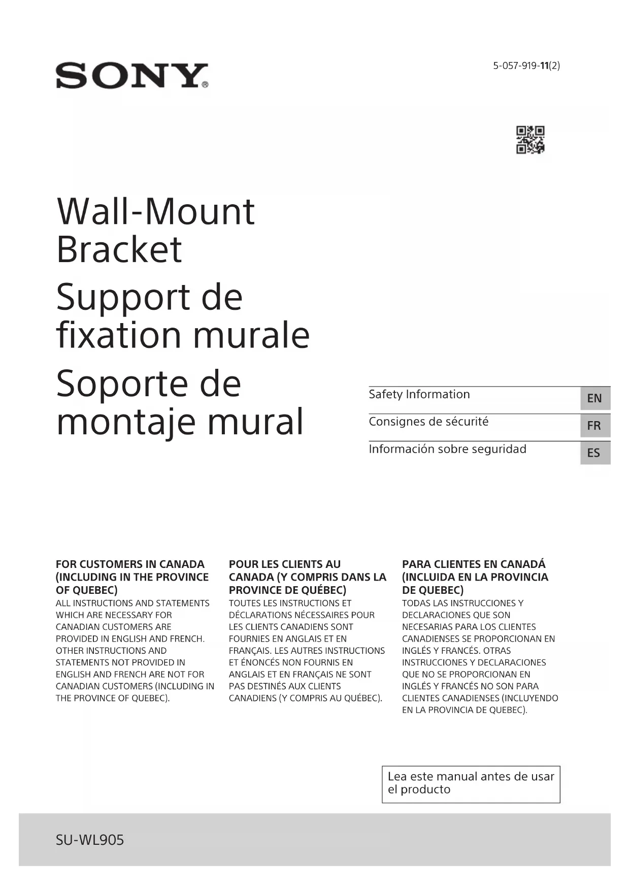 Design and specifications are subject to change without notice.− 2 (FR) − Support de fixation murale Sécurité Nous vous remercions d’avoir fait l’acquisition de ce produit. À l’attention des clients Installation du téléviseur ou écran LCD au mur AVERTISSEMENT INSTALLATION PROFESSIONNELLE REQUISE Ce produit doit uniquement être installé par un installateur professionnel formé pour vérifier la résistance du mur qui devra soutenir le poids du téléviseur ou écran LCD. S’il n’est pas fixé correctement pendant l’installation, le téléviseur ou écran LCD pourrait tomber et provoquer des blessures. Sony n’est pas responsable des dommages ou blessures provoquées par une mauvaise manipulation ou une mauvaise installation, ou par l’installation d’autres produits que le produit installable. Vos droits légaux (le cas échéant) ne sont pas affectés. Aux détaillants Sony L’installation de ce produit nécessite une certaine compétence. Veillez à lire attentivement le mode d’emploi pour installer le produit en toute sécurité. Sony n’est pas responsable des dommages ou blessures provoquées par une mauvaise manipulation ou une mauvaise installation. Une fois l’installation terminée, veuillez remettre ce manuel d’installation au client. Ce mode d’emploi indique comment manipuler le produit correctement et contient des précautions essentielles à prendre pour éviter tout accident. Lisez attentivement ce mode d’emploi et veillez à utiliser le produit correctement. Dans le cas contraire, vous risquez de vous blesser gravement ou de causer des dommages matériels et d’annuler la garantie. Conservez ce manuel pour toute référence ultérieure. Les produits Sony sont conçus pour vous offrir le maximum de sécurité. Toutefois, si les produits sont utilisés de façon incorrecte, ils peuvent entraîner des blessures graves en provoquant un incendie ou l’électrocution, ou encore la chute de l’appareil hors de son support. Veillez à observer les consignes de sécurité préconisées pour éviter de tels accidents. À l’attention des clients AVERTISSEMENT Le non-respect des consignes suivantes peut être fatal ou entraîner des blessures graves en provoquant un incendie, l’électrocution ou la chute de l’appareil. Veillez à confier l’installation à des entrepreneurs autorisés et à laisser les enfants à l’écart pendant l’installation. Si le Support de fixation murale ou le téléviseur ou écran LCD n’est pas installé correctement, les accidents suivants peuvent se produire. Veillez à confier l’installation à des installateurs agréés.