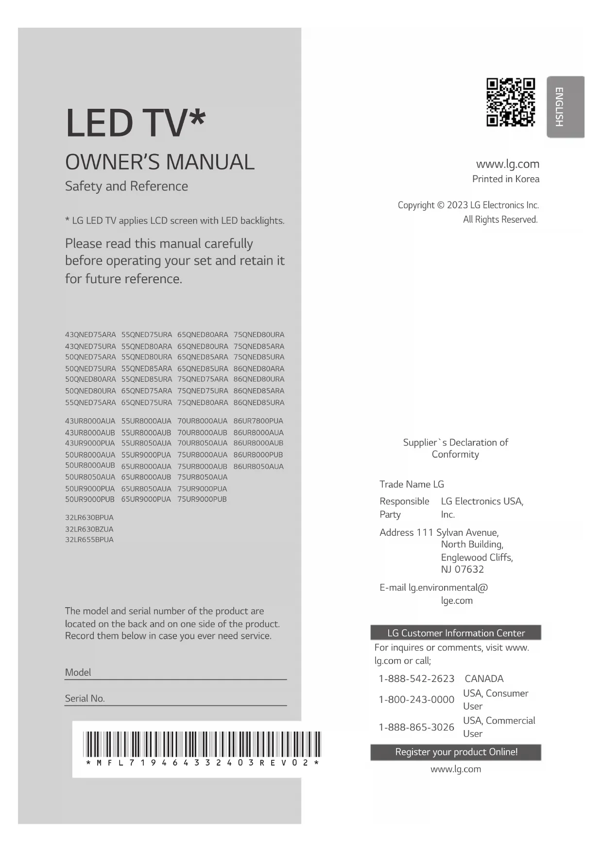 Partie responsable LG Electronics USA, inc. Adresse 111, Sylvan Avenue, North Building, Englewood Cliffs, NJ07632 Courriel lg.environmental@ lge.com Service à la clientèle LG Pour toute question ou tout commentaire, visitez le www.lg.com ou appelez :
