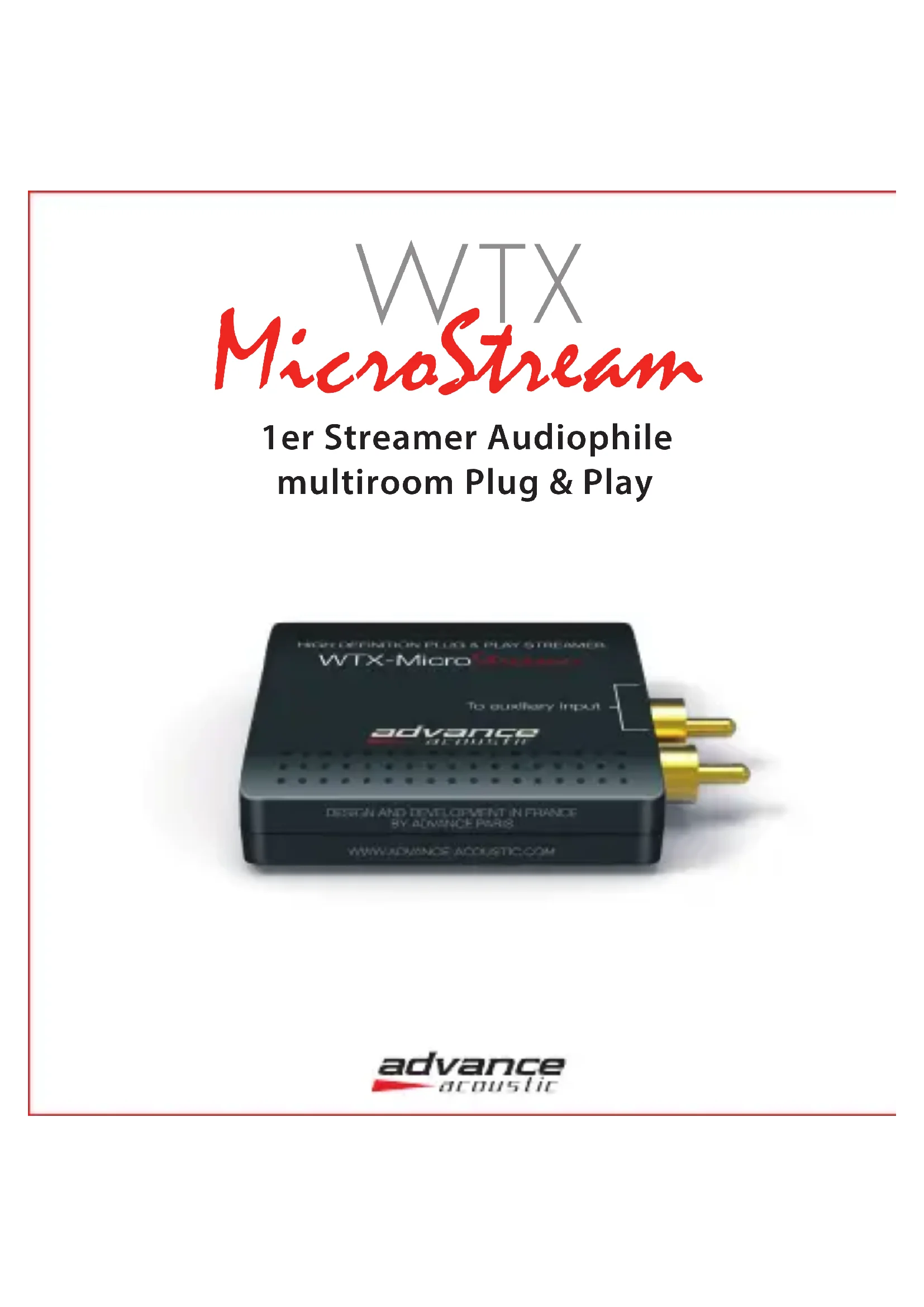 WTX MicroStream 1er Streamer Audiophile multiroom Plug & PlayLe WTX MicroStreamer est un streamer sans l WiFi possédant une qualité de son HiFi grâce à son convertisseur audiophile WOLFSON. Plug & Play, il se connecte facilement sur votre chaine HiFi, votre amplicateur, votre barre de son ou votre home cinema et transmettra le son en haute qualité à travers votre réseau WiFi domestique. Notre système est multiroom vous permettant ainsi de diuser votre propre musique (PC/MAC, NAS, etc...) ou les service de streaming comme Spotify, Tidal, etc... ou des services de radio. Le WTX MicroStreamer est évolutif et des mises à jour de l’application Android ou iOS seront disponibles en fonction de l’ajout de nouveaux services. Qu’est-ce que le WTX MicroStreamer ?Ce que vous devez trouver dans la boite - Le WTX MicroStream x1 - Le transformateur x1 - La prise EC (Europe) x1 - La prise UK x1 - La prise US x1L’ interface Bouton WPS pour appairage Led Prise alim. Canal gauche Canal droit Connecteurs RCATélécharger l’application Android ou iOS - Pour contrôler votre WTX MicroStreamer, vous devez télécharger sur l’App Store (Apple) ou sur Google Play (Android) l’application Advance Playstream. Advance Playstream est le nom de l’applicationConnecter votre WTX MicroStreamer à l’aide du WPS - Assurez-vous que le Wi de votre smartphone ou tablette est activé sur votre réseau domestique - Lancer l’application ADVANCE PLAYSTREAM et suivez les instructions. Vous devez taper le mot de passe de votre routeur dans l’application Advance Playstream - Appuyez sur le bouton WPS du WTX MicroStreamerOu se connecter manuellement - Aller dans les réglages généraux de votre smartphone WiFi (WLAN) - Connectez vous au WTX MicroStreamer - Entrez l’adresse http://10.10.10.254 dans votre browser et ouvrez l’interface de contrôle. - Choisir WiFi > votre router WiFi > entrer votre mot de passe et la connection s’opère.Réglages du streaming multiroom - L’application Advance Playstream vous permet de choisir dans quelles pièces vous souhaitez transmettre votre musique. De nombreuses combinaisons sont possibles. Musiques identiques ou pas dans une ou plusieurs pièces. - Activer une zone: Sélectionner le WTX choisi en maintenant le doigt puis faites glisser vers le haut d’un autre WTX que vous souhaitez associer. - Désactiver une zone: Sélectionner le WTX que vous souhaitez supprimer et faites le glisser sur l’espace blanc.L’application contrôle votre WTX MicroStreamer L’application contrôle les fonctions de multiroom, multicanaux, réglages, renommage des WTX, des infos des HPs, des mots de passe, langues, timer, alarme et 6 listes de lecture. Ajouter un nouveau WTX Rafraichir l’écran Réglages Choisir L+R (stereo) ou L (gauche) or R (Droit)) Choisir L+R (stereo) ou L (Gauche) or R (Droit) Réglages WTX 1 WTX 2 Lecture/Pause TOUSMenu lecture Lorsqu’un morceau de musique est en lecture, vous avez accés aux informations ci-dessous: Source active Pochette Favoris Zone (pièce) Faire glisser pour accéder à la liste de lecture Listes de lecture Barre de progression Volume Suivant Lecture/Pause Continu PrécédentVos sources
