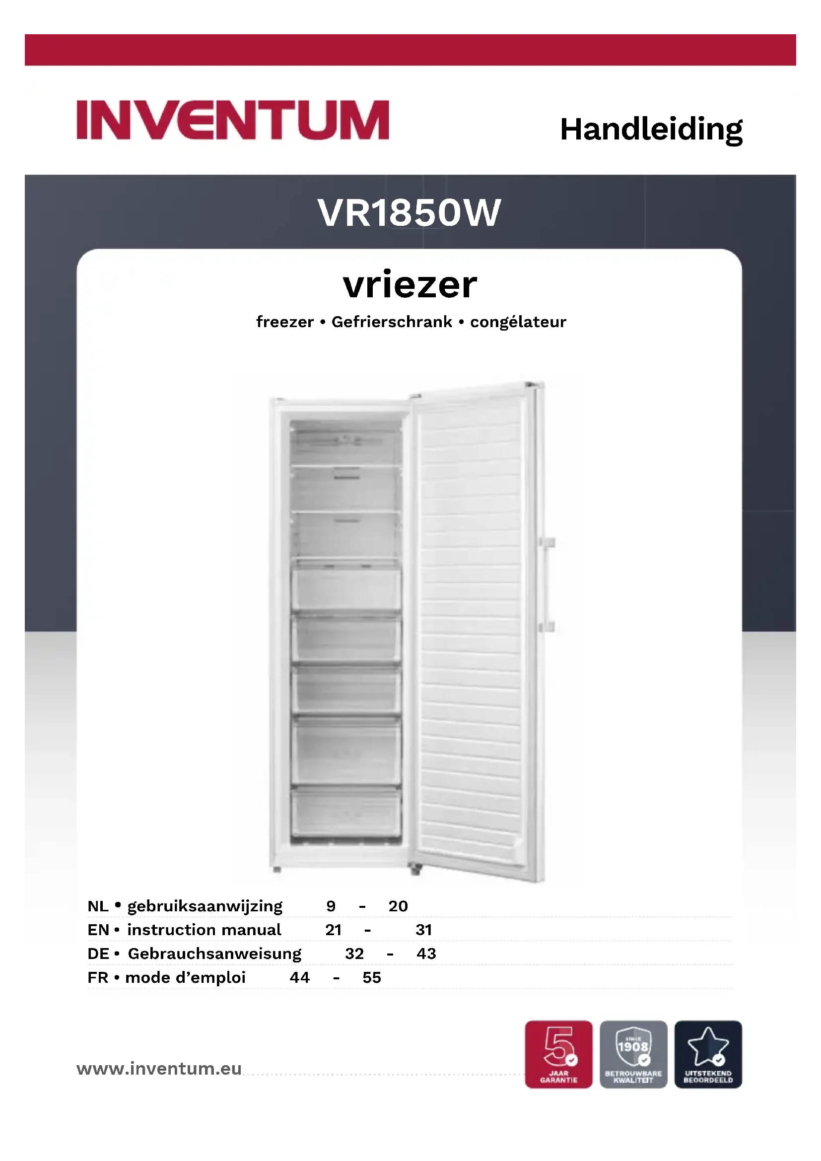 - Les produits éligibles pour le remplacement ou la réparation doivent être vidés et propres. Pour une explication détaillée des conditions de garantie et des éléments qui en sont exclus, rendez-vous sur le site Web d'Inventum : www.inventum.eu/algemene-voorwaarden Les présentes conditions générales de garantie et de service après-vente s'appliquent aux produits de la marque Inventum dont la date d'achat est postérieure au 27 avril 2022 et qui sont utilisés aux Pays-Bas. Pour les produits Inventum utilisés en dehors des Pays-Bas, mais dans un pays de l'UE, les règles de garantie de ce pays s'appliquent. Inventum n’offre une garantie et un service après-vente par un technicien spécialisé en appareils électroménagers qu’aux Pays-Bas uniquement. En tant que consommateur, vous avez droit, en vertu de la loi, à un produit fiable. Le produit tombe en panne plus tôt que prévu ? Il est alors question de non-conformité. Dans un tel cas, la loi vous offre, en tant qu'acheteur, un certain nombre de recours pour vous protéger. Cette protection juridique n'est pas affectée par la garantie commerciale ci-dessus accordée par Inventum sur les produits Inventum utilisés aux Pays-Bas. Inventum Huishoudelijke Apparaten B.V., Meander 901, 6825 MH Arnhem, Nederland (Pays-Bas)www.inventum.eu Inventum Huishoudelijke Apparaten B.V. Postbus 5023 6802 EA Arnhem www.inventum.eu facebook.com/inventum1908 pinterest.com/inventum1908 youtube.com/inventum1908 instagram.com/inventum1908 VR1850W/01.0224 Wijzigingen en drukfouten voorbehouden Änderungen und Druckfehler vorbehalten Sous réserve de modication Modications and errors reserved