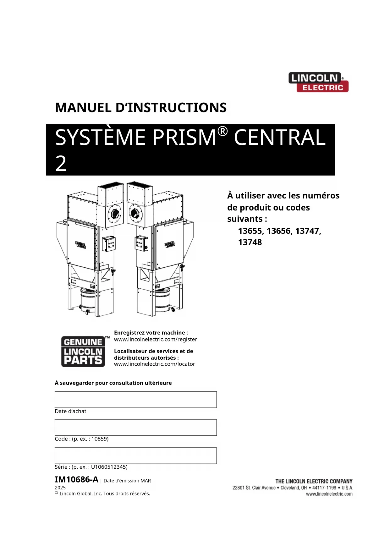 Enregistrez votre machine : www.lincolnelectric.com/register Localisateur de services et de distributeurs autorisés : www.lincolnelectric.com/locator À sauvegarder pour consultation ultérieure Date d’achat Code : (p. ex. : 10859) Série : (p. ex. : U1060512345) IM10686-A | Date d’émission MAR -