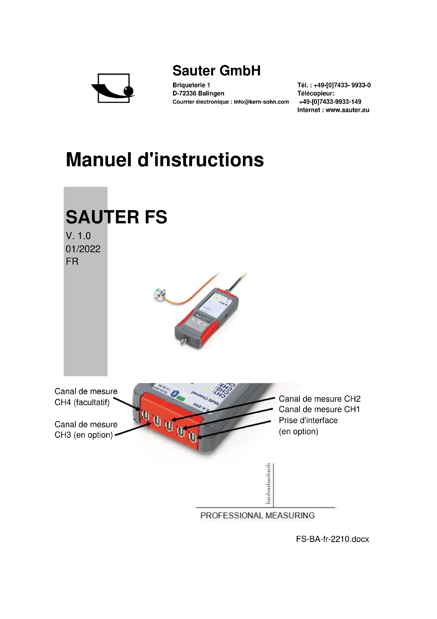 - 16 Déclaration de conformité FS-BA-fr-2210.docx 5 1 Introduction Lisez attentivement ce mode d'emploi avant la mise en service, même si vous avez déjà de l'expérience avec les appareils de mesure SAUTER. SAUTER propose le logiciel et les accessoires en option afin de rendre l'appareil de mesure plus polyvalent dans son utilisation. Veuillez vous renseigner auprès de SAUTER ou de votre revendeur SAUTER, ou visitez notre site Internet www.sauter.eu. 2 Vérifier avant l'utilisation Après réception de l'appareil, il convient de vérifier au préalable qu'il n'a pas été endommagé pendant le transport, que le suremballage, le boîtier en plastique, d'autres pièces ou même l'appareil lui-même n'ont pas été endommagés. Si des dommages sont visibles, veuillez en informer immédiatement le revendeur ou le fabricant. 3 Motif de l'utilisation L'appareil SAUTER FS est destiné à la mesure de forces et de couples dans un environnement industriel. 4 Avertissements p. 28