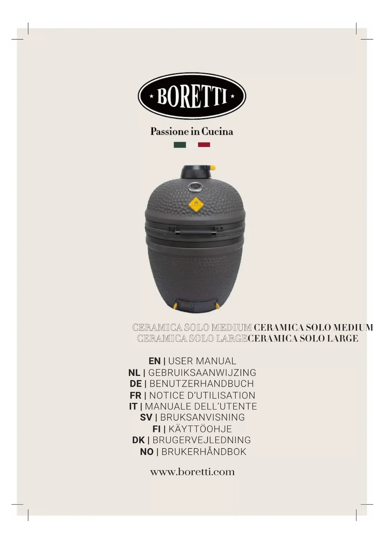 FR Boretti Ceramica Solo Medium & Large/Manuel d'utilisation Introduction Félicitations pour l'achat de votre nouveau barbecue. Nous sommes convaincus qu'avec votre passion pour le barbecue et l'art de vivre à l'extérieur, vous transformerez une soirée d'été ordinaire en une superbe buona sera et votre jardin en un giardino. Squadra Boretti Lisez attentivement ce manuel et conservez-le en lieu sûr ! Ce manuel contient des instructions spécifiques concernant votre sécurité, le montage, le fonctionnement et l'entretien de votre barbecue. Utilisez le barbecue uniquement comme indiqué dans ce manuel. Le bon sens et la prudence lors de l'utilisation sont un must incontournable !64