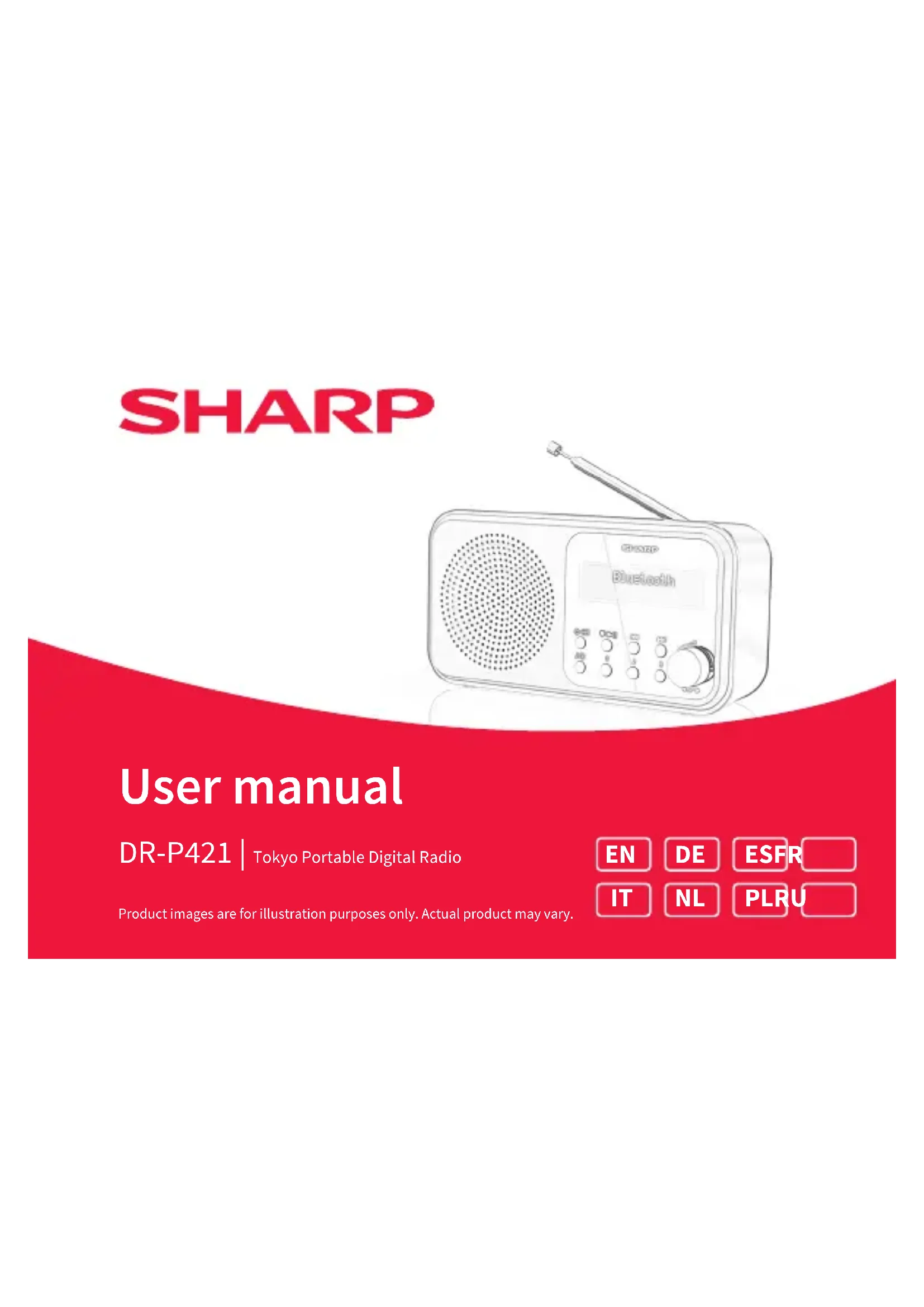 - Réinitialisez l'appareil aux paramètres d'usine.88 Remarque: Tous vos paramètres, y compris la liste des stations de radio, les appareils Bluetooth connectés et tous les préréglages seront supprimés lors d'une réinitialisation aux paramètres d'usine.FR Spécications techniques Entrée 5V CC Piles 4 x 1,5 V taille AA (LR-6) (en option, non fournies) Sortie audio 2 Watts RMS Consommation électrique Active: < 2 W Veille: < 2 mW Plage de fréquences DAB: Bande III, 174 à 240 MHz Plage de fréquences FM 87,5 à 108MHz Bluetooth 2,4- 2,480GHz Nom d'appariement SHARP DR-P421 Dimensions (L) x (H) x (P) mm 174 x 90 x 53 Poids approx. 0,39 kg90 Importanti istruzioni di sicurezza Seguire tutte le istruzioni di sicurezza e fare attenzione a tutte le avvertenze. Conservare il manuale per consultazioni future. CAUTION
