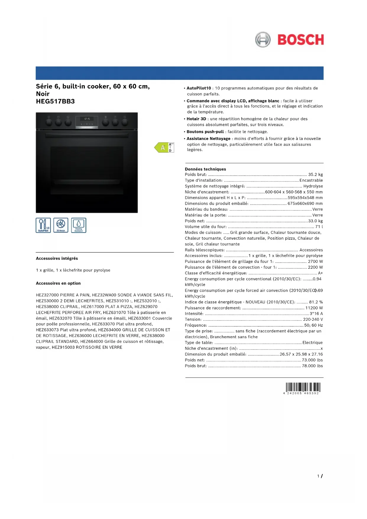 Série 6, built-in cooker, 60 x 60 cm, Noir HEG517BB3 Accessoires intégrés 1 x grille, 1 x lèchefrite pour pyrolyse Accessoires en option HEZ327000 PIERRE A PAIN, HEZ32WA00 SONDE A VIANDE SANS FIL, HEZ530000 2 DEMI LECHEFRITES, HEZ531010 :, HEZ532010 :, HEZ538000 CLIPRAIL, HEZ617000 PLAT A PIZZA, HEZ629070 LECHEFRITE PERFOREE AIR FRY, HEZ631070 Tôle à patisserie en émail, HEZ632070 Tôle à pâtisserie en émaill, HEZ633001 Couvercle pour poêle professionnelle, HEZ633070 Plat ultra profond, HEZ633073 Plat ultra profond, HEZ634000 GRILLE DE CUISSON ET DE ROTISSAGE, HEZ636000 LECHEFRITE EN VERRE, HEZ638000 CLIPRAIL STANDARD, HEZ664000 Grille de cuisson et rôtissage, vapeur, HEZ915003 ROTISSOIRE EN VERRE
