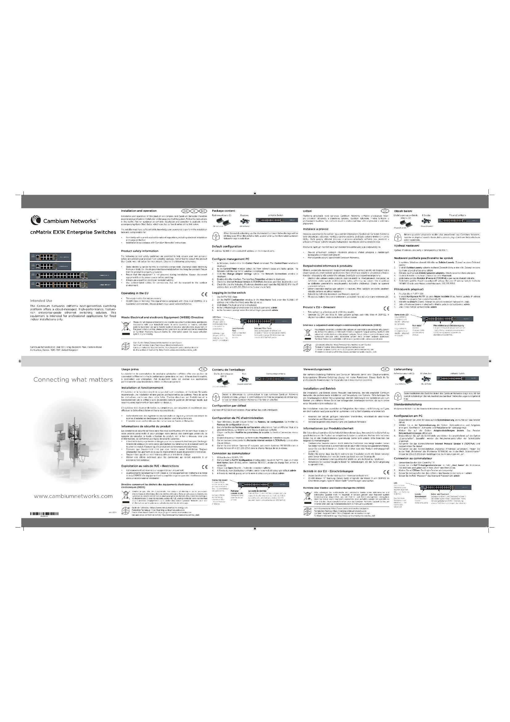Couleur du voyant Le logo cnMatrix (alimentation) éclairé en bleu de manière fixe – le commutateur est opérationnel. Le logo cnMatrix (alimentation) clignote en bleu – le commutateur s’initialise. Port pour console locale Connexion RJ45 pour l’accès par console. Les ports de données Data et Fiber (cuivre et fibre optique) ont une capacité d’acheminement du trafic de 1 Gb/s. Les ports avec une bordure orange (30 W) peuvent fournir une alimentation 802.3at PoE. Oreilles de montage en rack (2) (24 port only) (24 port only) (Pouze 24 portů) (Pouze 24 portů) (24 ports seulement)(24 ports seulement) Lieferumfang 8 Schrauben cnMatrix Switch Beim Hochfahren des Switches blinkt das Cambium Networks-Logo blau. Ist der Switch vollständig in Betrieb, leuchtet das Cambium Networks-Logo durchgehend blau. Standardeinstellung IP-Adresse 192.168.1.1 ist die Standard-IP-Adresse auf den In-Band-Ports. Konfiguration am PC
