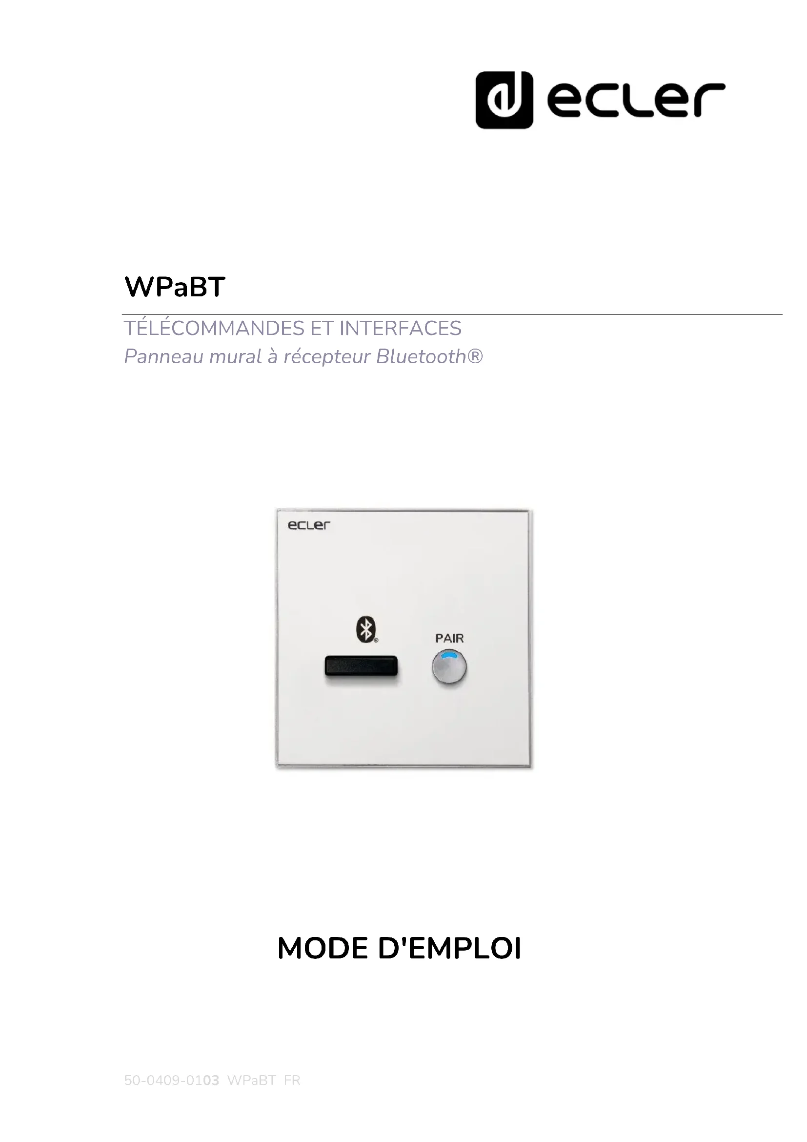 ménagers non triés. Rapportez-le au centre de traitement des déchets électriques et électroniques le plus proche.5 NEEC AUDIO BARCELONA, S.L. décline toute responsabilité pour les dommages qui pourraient être causés aux personnes, animaux ou objets suite au non-respect des avertissements ci-dessus. NOTE IMPORTANTE Merci d'avoir choisi notre panneau mural à récepteur Bluetooth® WPaBT Ecler ! Il est TRÈS IMPORTANT de lire attentivement ce mode d’emploi et d'en comprendre parfaitement le contenu avant toute connexion afin de maximiser votre utilisation et de tirer les meilleures performances de cet équipement. Pour garantir un fonctionnement optimal de cet appareil, nous vous recommandons de faire assurer sa maintenance par nos services techniques agréés. Tous les produits ECLER bénéficient de garantie, veuillez-vous référer sur www.ecler.com ou la carte de garantie incluse avec cet appareil pour la période de validité et ses conditions. INTRODUCTION Le WPaBT est un récepteur Bluetooth® de classe 1 avec une sortie stéréo symétrique sur Euroblock. Boîtier d'installation en surface fourni. Les principales caractéristiques du panneau mural à récepteur Bluetooth® WPaBT sont :