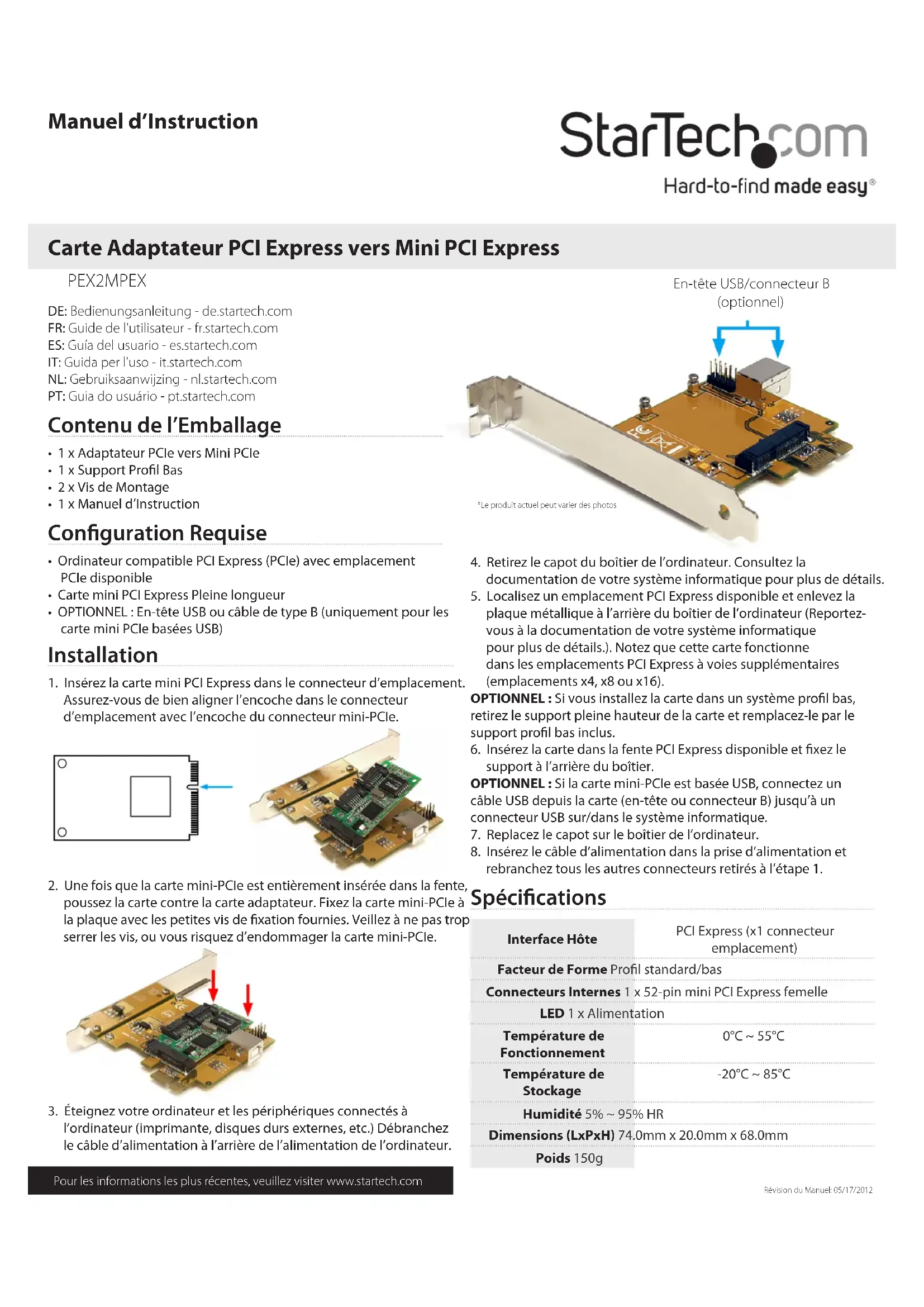 rebranchez tous les autres connecteurs retirés à l’étape 1. En-tête USB/connecteur B (optionnel) *Le produit actuel peut varier des photos Spécications Interface Hôte PCI Express (x1 connecteur emplacement) Facteur de Forme Prol standard/bas Connecteurs Internes 1 x 52-pin mini PCI Express femelle LED 1 x Alimentation Température de Fonctionnement 0°C ~ 55°C Température de Stockage -20°C ~ 85°C Humidité 5% ~ 95% HR Dimensions (LxPxH) 74.0mm x 20.0mm x 68.0mm Poids 150gDéclaration de conformité FCC Cet équipement a été testé et déclaré conforme en tant que dispositif numérique de classe B, conformément à la section 15 des règles FCC. Ces limites sont conçues pour fournir une protection raisonnable contre les interférences nuisibles dans une installation résidentielle. Cet équipement génère, utilise et peut émettre des fréquences radio et, s’il n’est pas installé et utilisé conformément aux instructions, il peut causer des interférences nuisibles aux communications radio. Cependant, il n’existe aucune garantie que des interférences ne se produiront pas dans une installation de type particulier. Si cet équipement provoque des interférences nuisibles à la réception de la radio ou de la télévision, pouvant être vérié en mettant l’équipement hors tension, l’utilisateur est encouragé à essayer de corriger l’interférence par une ou plusieurs des mesures suivantes: