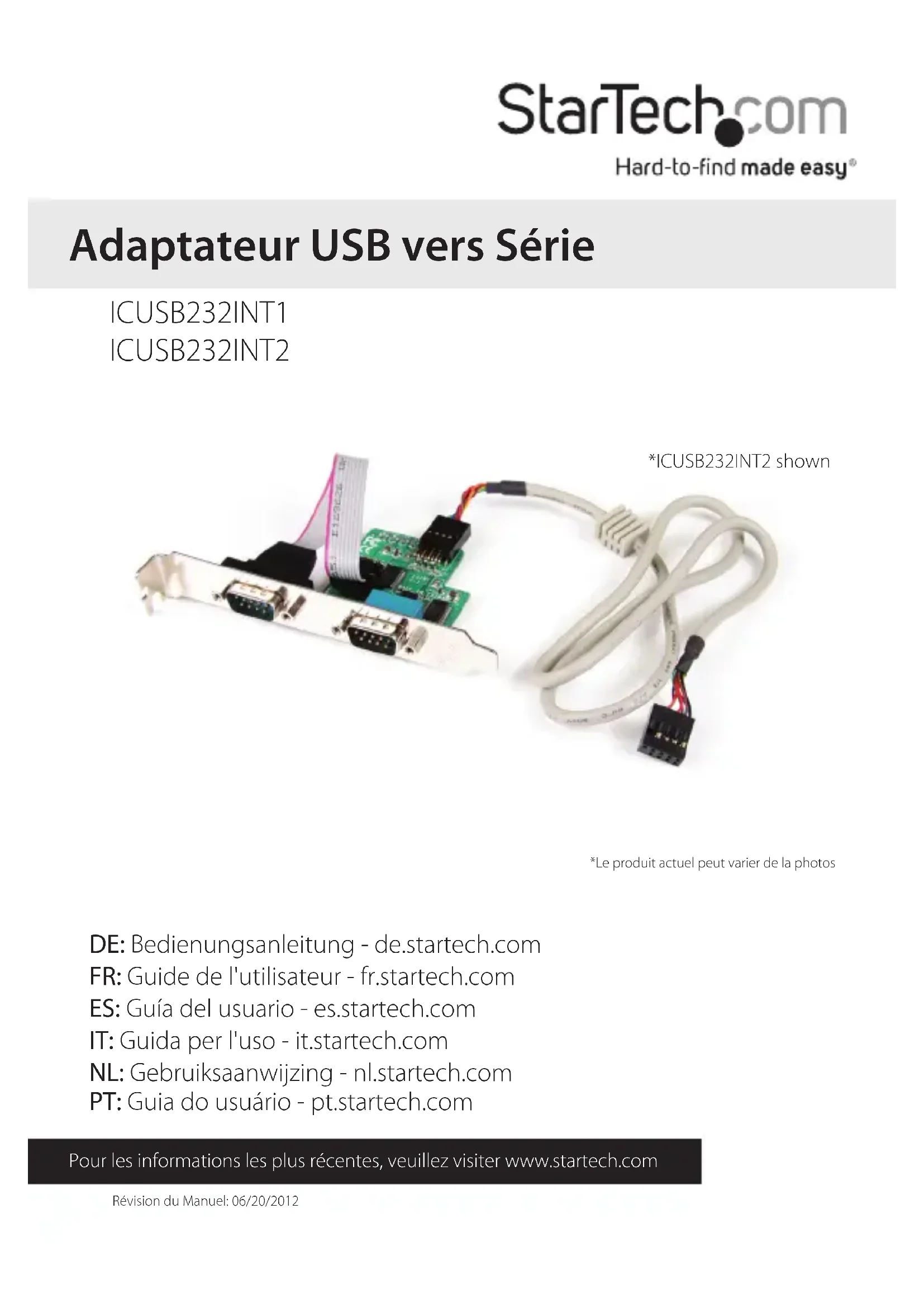 Révision du Manuel: 06/20/2012 Pour les informations les plus récentes, veuillez visiter www.startech.com DE: Bedienungsanleitung - de.startech.com FR: Guide de l'utilisateur - fr.startech.com ES: Guía del usuario - es.startech.com IT: Guida per l'uso - it.startech.com NL: Gebruiksaanwijzing - nl.startech.com PT: Guia do usuário - pt.startech.com ICUSB232INT1 ICUSB232INT2 *Le produit actuel peut varier de la photos Adaptateur USB vers Série *ICUSB232INT2 shownManuel d’Instruction Déclaration de conformité FCC Cet équipement a été testé et déclaré conforme en tant que dispositif numérique de classe B, conformément à la section 15 des règles FCC. Ces limites sont conçues pour fournir une protection raisonnable contre les interférences nuisibles dans une installation résidentielle. Cet équipement génère, utilise et peut émettre des fréquences radio et, s’il n’est pas installé et utilisé conformément aux instructions, il peut causer des interférences nuisibles aux communications radio. Cependant, il n’existe aucune garantie que des interférences ne se produiront pas dans une installation de type particulier. Si cet équipement provoque des interférences nuisibles à la réception de la radio ou de la télévision, pouvant être vérié en mettant l’équipement hors tension, l’utilisateur est encouragé à essayer de corriger l’interférence par une ou plusieurs des mesures suivantes: