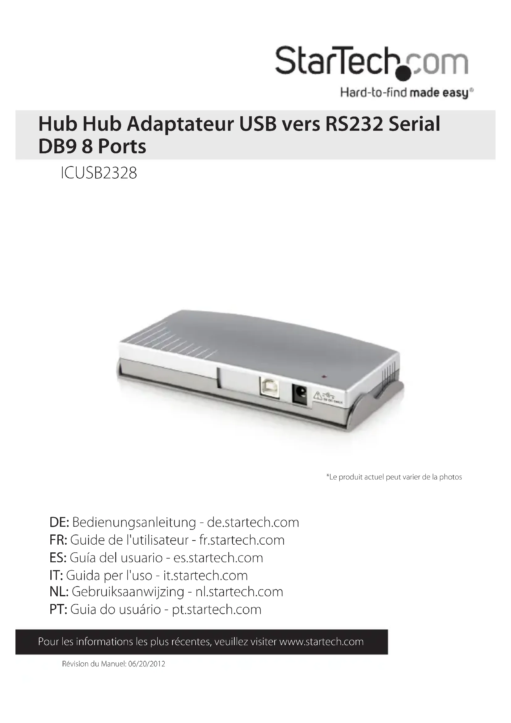 Révision du Manuel: 06/20/2012 Pour les informations les plus récentes, veuillez visiter www.startech.com DE: Bedienungsanleitung - de.startech.com FR: Guide de l'utilisateur - fr.startech.com ES: Guía del usuario - es.startech.com IT: Guida per l'uso - it.startech.com NL: Gebruiksaanwijzing - nl.startech.com PT: Guia do usuário - pt.startech.com ICUSB2328 *Le produit actuel peut varier de la photos Hub Hub Adaptateur USB vers RS232 Serial DB9 8 PortsManuel d’Instruction Déclaration de conformité FCC Cet équipement a été testé et déclaré conforme en tant que dispositif numérique de classe B, conformément à la section 15 des règles FCC. Ces limites sont conçues pour fournir une protection raisonnable contre les interférences nuisibles dans une installation résidentielle. Cet équipement génère, utilise et peut émettre des fréquences radio et, s’il n’est pas installé et utilisé conformément aux instructions, il peut causer des interférences nuisibles aux communications radio. Cependant, il n’existe aucune garantie que des interférences ne se produiront pas dans une installation de type particulier. Si cet équipement provoque des interférences nuisibles à la réception de la radio ou de la télévision, pouvant être vérié en mettant l’équipement hors tension, l’utilisateur est encouragé à essayer de corriger l’interférence par une ou plusieurs des mesures suivantes: