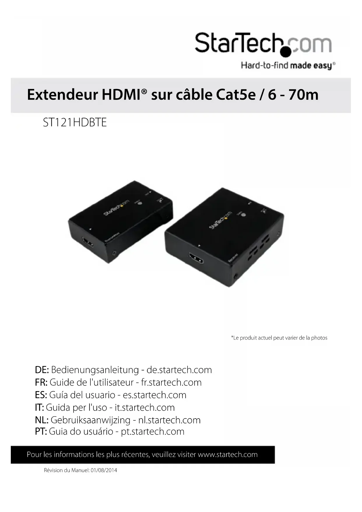 Révision du Manuel: 01/08/2014 Pour les informations les plus récentes, veuillez visiter www.startech.com DE: Bedienungsanleitung - de.startech.com FR: Guide de l'utilisateur - fr.startech.com ES: Guía del usuario - es.startech.com IT: Guida per l'uso - it.startech.com NL: Gebruiksaanwijzing - nl.startech.com PT: Guia do usuário - pt.startech.com ST121HDBTE *Le produit actuel peut varier de la photos Extendeur HDMI® sur câble Cat5e / 6 - 70mManuel d’Instruction Déclaration de conformité FCC Cet équipement a été testé et déclaré conforme en tant que dispositif numérique de classe B, conformément à la section 15 des règles FCC. Ces limites sont conçues pour fournir une protection raisonnable contre les interférences nuisibles dans une installation résidentielle. Cet équipement génère, utilise et peut émettre des fréquences radio et, s’il n’est pas installé et utilisé conformément aux instructions, il peut causer des interférences nuisibles aux communications radio. Cependant, il n’existe aucune garantie que des interférences ne se produiront pas dans une installation de type particulier. Si cet équipement provoque des interférences nuisibles à la réception de la radio ou de la télévision, pouvant être vérié en mettant l’équipement hors tension, l’utilisateur est encouragé à essayer de corriger l’interférence par une ou plusieurs des mesures suivantes: