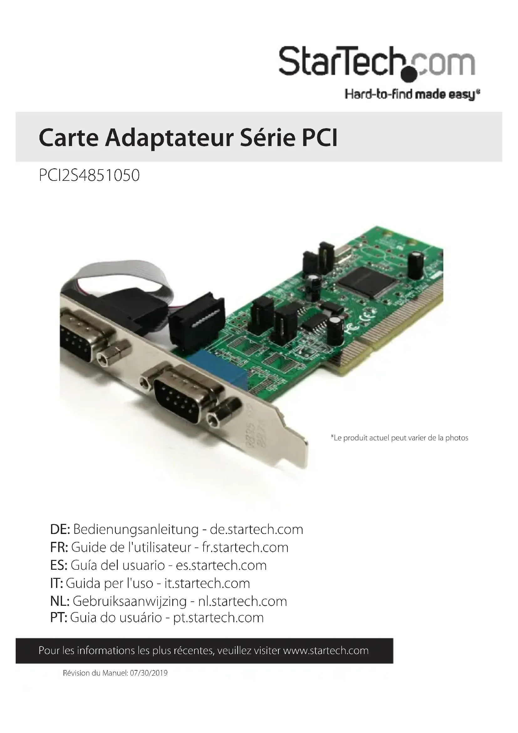 Révision du Manuel: 07/30/2019 Pour les informations les plus récentes, veuillez visiter www.startech.com DE: Bedienungsanleitung - de.startech.com FR: Guide de l'utilisateur - fr.startech.com ES: Guía del usuario - es.startech.com IT: Guida per l'uso - it.startech.com NL: Gebruiksaanwijzing - nl.startech.com PT: Guia do usuário - pt.startech.com PCI2S4851050 Carte Adaptateur Série PCI *Le produit actuel peut varier de la photosManuel d’Instruction Déclaration de conformité FCC Cet équipement a été testé et déclaré conforme en tant que dispositif numérique de classe B, conformément à la section 15 des règles FCC. Ces limites sont conçues pour fournir une protection raisonnable contre les interférences nuisibles dans une installation résidentielle. Cet équipement génère, utilise et peut émettre des fréquences radio et, s’il n’est pas installé et utilisé conformément aux instructions, il peut causer des interférences nuisibles aux communications radio. Cependant, il n’existe aucune garantie que des interférences ne se produiront pas dans une installation de type particulier. Si cet équipement provoque des interférences nuisibles à la réception de la radio ou de la télévision, pouvant être vérié en mettant l’équipement hors tension, l’utilisateur est encouragé à essayer de corriger l’interférence par une ou plusieurs des mesures suivantes: