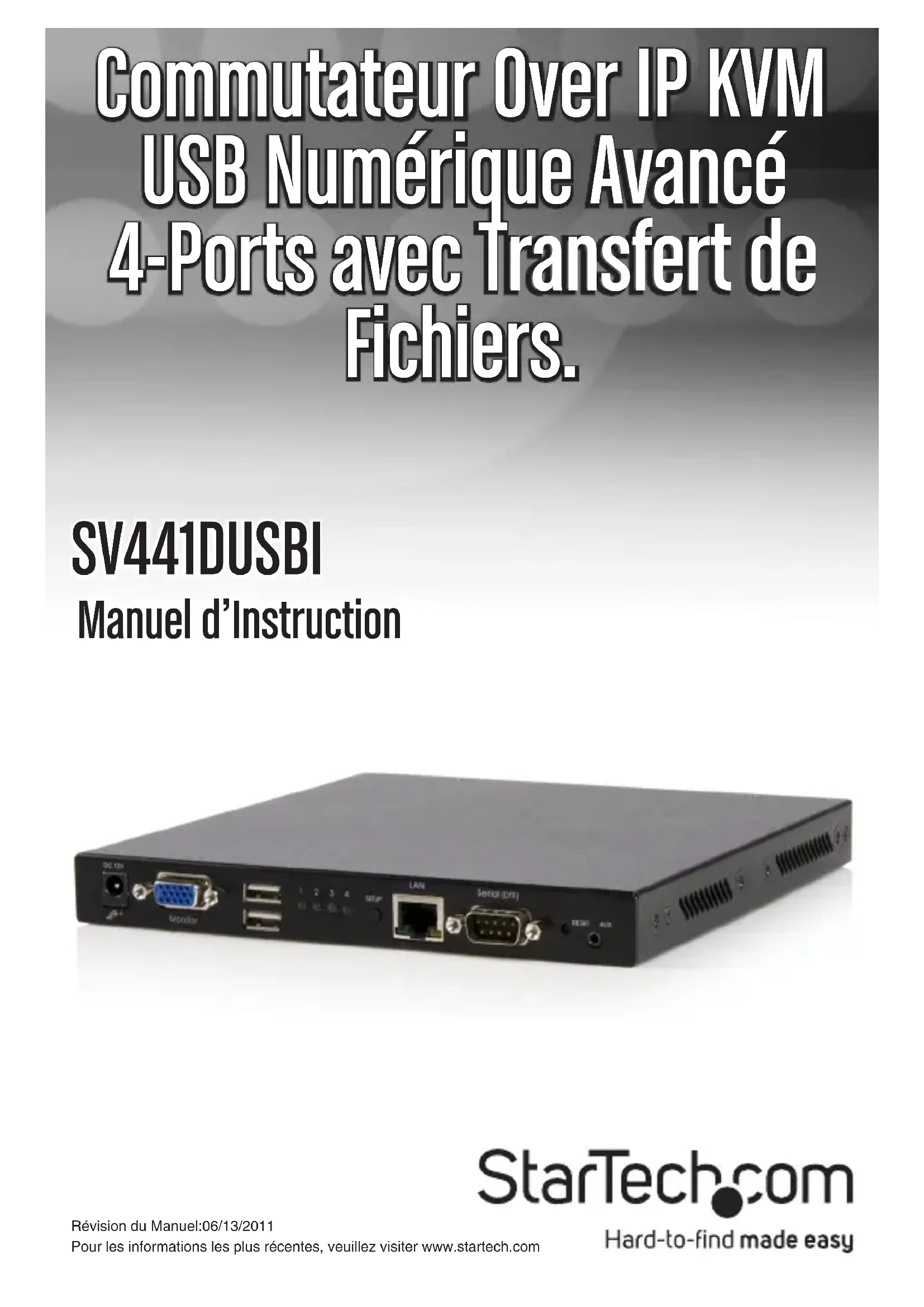 SV441DUSBI Commutateur Over IP KVM USB Numérique Avancé 4-Ports avec Transfert de Fichiers. Manuel d’Instruction Révision du Manuel:06/13/2011 Pour les informations les plus récentes, veuillez visiter www.startech.comDéclaration de conformité FCC Cet équipement a été testé et déclaré conforme en tant que dispositif numérique de classe B, conformément à la section 15 des règles FCC. Ces limites sont conçues pour fournir une protection raisonnable contre les interférences nuisibles dans une installation résidentielle. Cet équipement génère, utilise et peut émettre des fréquences radio et, s’il n’est pas installé et utilisé conformément aux instructions, il peut causer des interférences nuisibles aux communications radio. Cependant, il n’existe aucune garantie que des interférences ne se produiront pas dans une installation de type particulier. Si cet équipement provoque des interférences nuisibles à la réception de la radio ou de la télévision, pouvant être vérifié en mettant l’équipement hors tension, l’utilisateur est encouragé à essayer de corriger l’interférence par une ou plusieurs des mesures suivantes:
