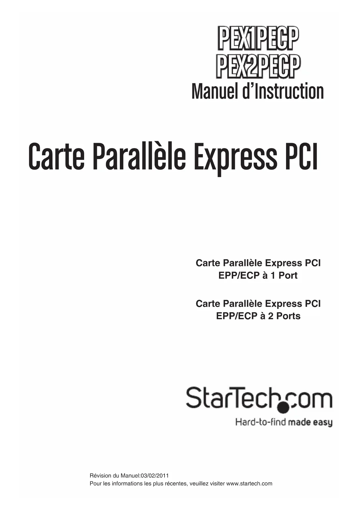 Carte Parallèle Express PCI Carte Parallèle Express PCI EPP/ECP à 1 Port PEX1PECP PEX2PECP Manuel d’Instruction Révision du Manuel:03/02/2011 Pour les informations les plus récentes, veuillez visiter www.startech.com Carte Parallèle Express PCI EPP/ECP à 2 PortsDéclaration de conformité FCC Cet équipement a été testé et déclaré conforme en tant que dispositif numérique de classe B, conformément à la section 15 des règles FCC. Ces limites sont conçues pour fournir une protection raisonnable contre les interférences nuisibles dans une installation résidentielle. Cet équipement génère, utilise et peut émettre des fréquences radio et, s’il n’est pas installé et utilisé conformément aux instructions, il peut causer des interférences nuisibles aux communications radio. Cependant, il n’existe aucune garantie que des interférences ne se produiront pas dans une installation de type particulier. Si cet équipement provoque des interférences nuisibles à la réception de la radio ou de la télévision, pouvant être vérifié en mettant l’équipement hors tension, l’utilisateur est encouragé à essayer de corriger l’interférence par une ou plusieurs des mesures suivantes: