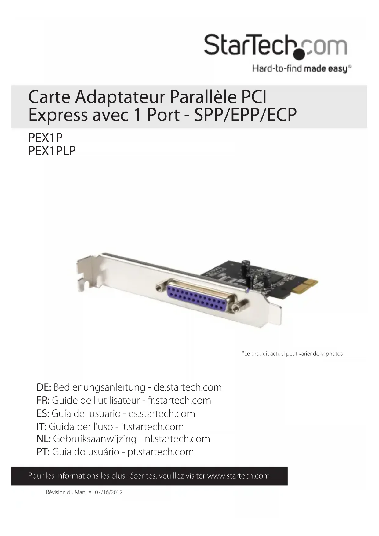 Révision du Manuel: 07/16/2012 Pour les informations les plus récentes, veuillez visiter www.startech.com DE: Bedienungsanleitung - de.startech.com FR: Guide de l'utilisateur - fr.startech.com ES: Guía del usuario - es.startech.com IT: Guida per l'uso - it.startech.com NL: Gebruiksaanwijzing - nl.startech.com PT: Guia do usuário - pt.startech.com *Le produit actuel peut varier de la photos Carte Adaptateur Parallèle PCI Express avec 1 Port - SPP/EPP/ECP PEX1P PEX1PLPManuel d’Instruction Déclaration de conformité FCC Cet équipement a été testé et déclaré conforme en tant que dispositif numérique de classe B, conformément à la section 15 des règles FCC. Ces limites sont conçues pour fournir une protection raisonnable contre les interférences nuisibles dans une installation résidentielle. Cet équipement génère, utilise et peut émettre des fréquences radio et, s’il n’est pas installé et utilisé conformément aux instructions, il peut causer des interférences nuisibles aux communications radio. Cependant, il n’existe aucune garantie que des interférences ne se produiront pas dans une installation de type particulier. Si cet équipement provoque des interférences nuisibles à la réception de la radio ou de la télévision, pouvant être vérié en mettant l’équipement hors tension, l’utilisateur est encouragé à essayer de corriger l’interférence par une ou plusieurs des mesures suivantes: