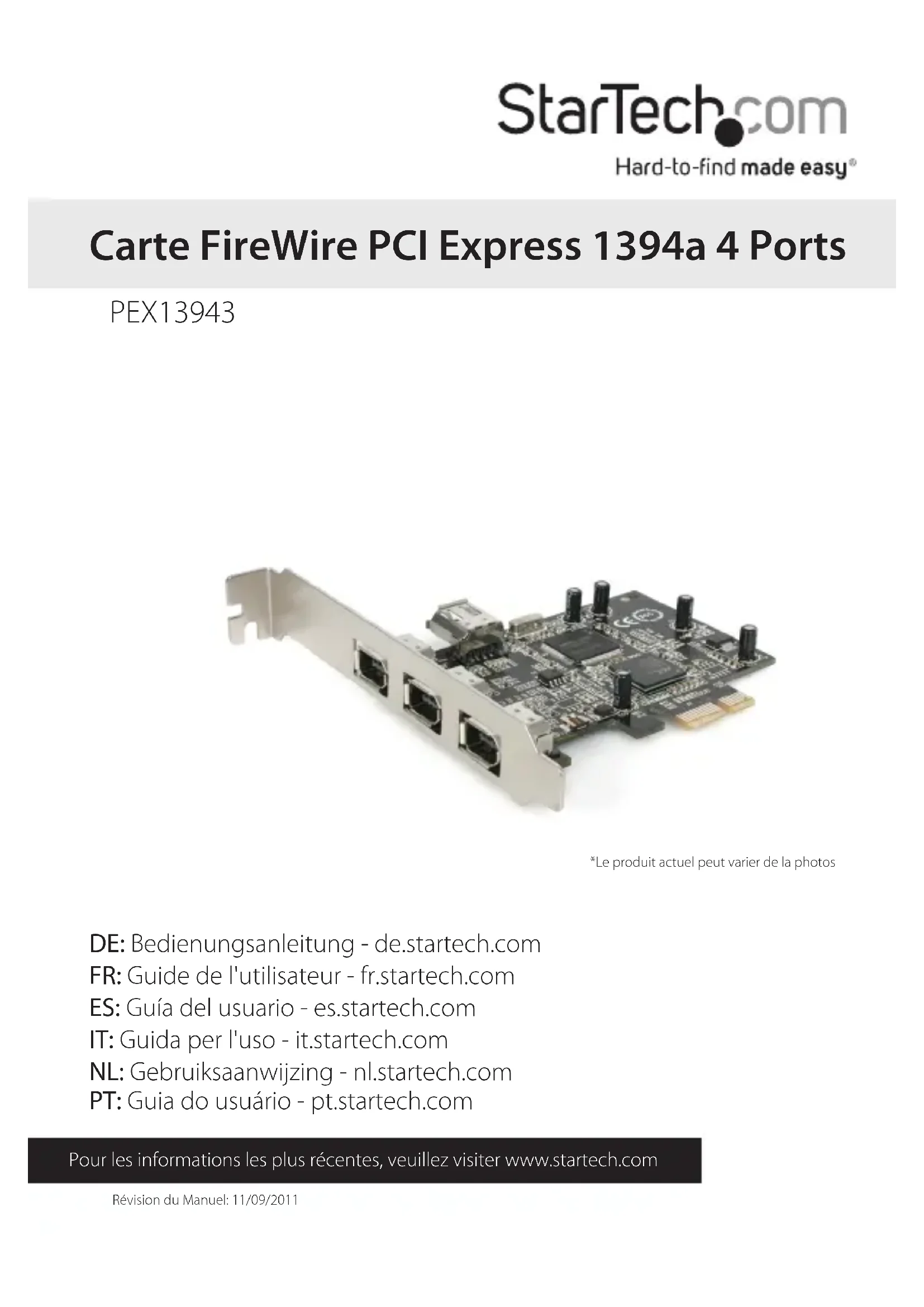 Révision du Manuel: 11/09/2011 Pour les informations les plus récentes, veuillez visiter www.startech.com DE: Bedienungsanleitung - de.startech.com FR: Guide de l'utilisateur - fr.startech.com ES: Guía del usuario - es.startech.com IT: Guida per l'uso - it.startech.com NL: Gebruiksaanwijzing - nl.startech.com PT: Guia do usuário - pt.startech.com PEX13943 Carte FireWire PCI Express 1394a 4 Ports *Le produit actuel peut varier de la photosManuel d’Instruction Déclaration de conformité FCC Cet équipement a été testé et déclaré conforme en tant que dispositif numérique de classe B, conformément à la section 15 des règles FCC. Ces limites sont conçues pour fournir une protection raisonnable contre les interférences nuisibles dans une installation résidentielle. Cet équipement génère, utilise et peut émettre des fréquences radio et, s’il n’est pas installé et utilisé conformément aux instructions, il peut causer des interférences nuisibles aux communications radio. Cependant, il n’existe aucune garantie que des interférences ne se produiront pas dans une installation de type particulier. Si cet équipement provoque des interférences nuisibles à la réception de la radio ou de la télévision, pouvant être vérié en mettant l’équipement hors tension, l’utilisateur est encouragé à essayer de corriger l’interférence par une ou plusieurs des mesures suivantes: