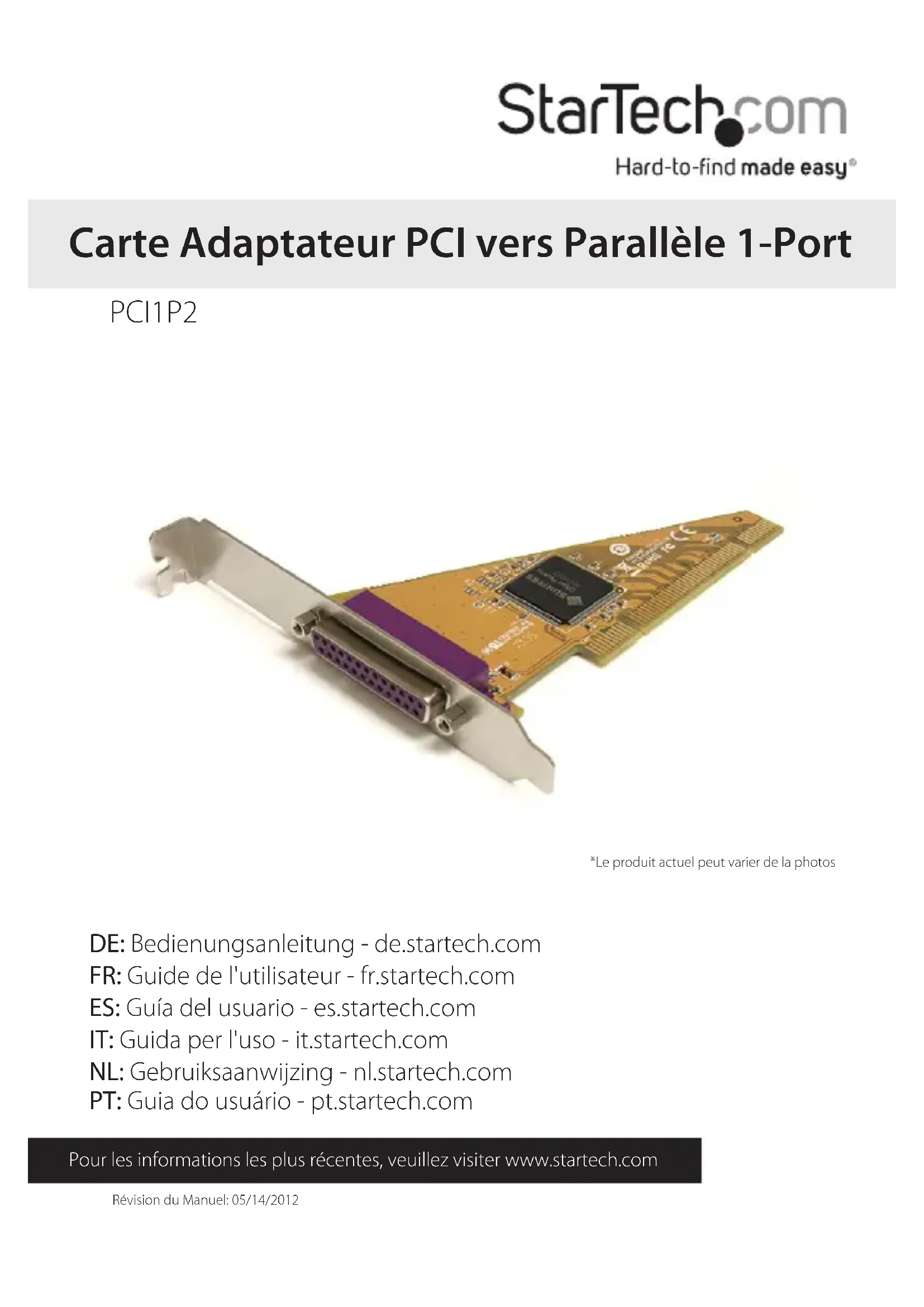 Révision du Manuel: 05/14/2012 Pour les informations les plus récentes, veuillez visiter www.startech.com DE: Bedienungsanleitung - de.startech.com FR: Guide de l'utilisateur - fr.startech.com ES: Guía del usuario - es.startech.com IT: Guida per l'uso - it.startech.com NL: Gebruiksaanwijzing - nl.startech.com PT: Guia do usuário - pt.startech.com PCI1P2 *Le produit actuel peut varier de la photos Carte Adaptateur PCI vers Parallèle 1-PortManuel d’Instruction Déclaration de conformité FCC Cet équipement a été testé et déclaré conforme en tant que dispositif numérique de classe B, conformément à la section 15 des règles FCC. Ces limites sont conçues pour fournir une protection raisonnable contre les interférences nuisibles dans une installation résidentielle. Cet équipement génère, utilise et peut émettre des fréquences radio et, s’il n’est pas installé et utilisé conformément aux instructions, il peut causer des interférences nuisibles aux communications radio. Cependant, il n’existe aucune garantie que des interférences ne se produiront pas dans une installation de type particulier. Si cet équipement provoque des interférences nuisibles à la réception de la radio ou de la télévision, pouvant être vérié en mettant l’équipement hors tension, l’utilisateur est encouragé à essayer de corriger l’interférence par une ou plusieurs des mesures suivantes: