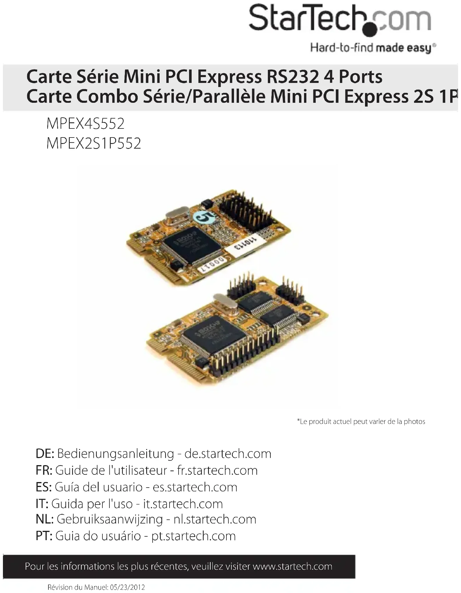 Introduction La Carte Série Mini PCI Express RS232 4 ports MPEX4S952 avec UART 16550 et la Carte Combo Série Parallèle Mini PCI Express MPEX2S1P552 2S1P transforment un emplacement mini-PCIe soit en quatre ports série RS232 (DB9) soit en deux ports série RS232 (DB9) et en un port parallèle IEEE 1284 - solution permettant une réduction des coûts pour l’ajout de périphériques série/parallèle plus anciens pour systèmes embarqués qui ne sont normalement pas compatibles. Une conception de puce unique PCI Express native vous permet de proter de la pleine capacité bus PCI Express, fournissant une amélioration de la vitesse et de la abilité tout en réduisant la charge appliquée au CPU par autant que 48% sur les cartes série “bridge chip” traditionnelles. Contenu de l’Emballage