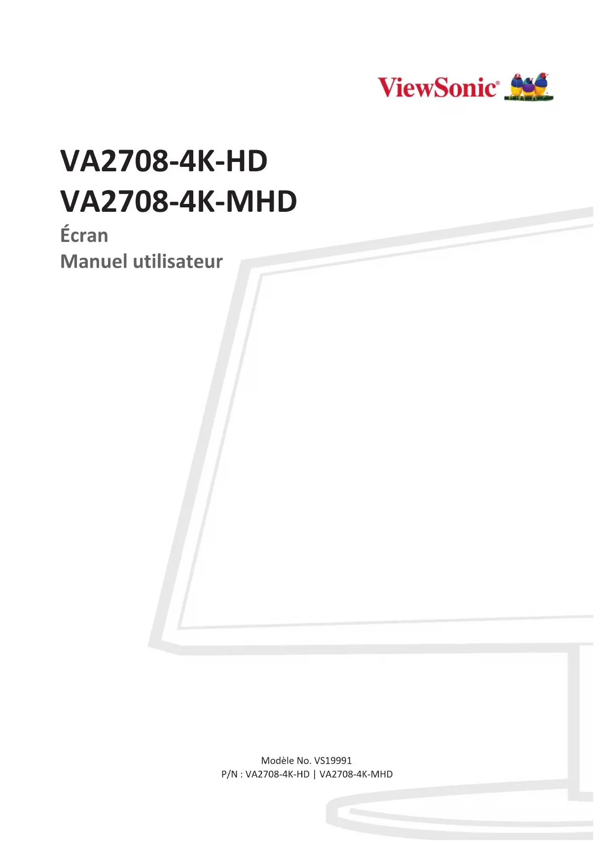Écran Manuel utilisateur Modèle No. VS19991 P/N : VA2708-4K-HD | VA2708-4K-MHD2 Merci d’avoir choisi ViewSonic® En tant que leader mondial de solutions visuelles, ViewSonic® se consacre à dépasser les attentes du monde en matière d’évolution technologique, d’innovation et de simplicité. Chez ViewSonic®, nous pensons que nos produits peuvent avoir un impact positif dans le monde et nous sommes convaincus que le produit ViewSonic® que vous avez choisi vous servira correctement. Une fois de plus, merci d’avoir choisi ViewSonic® !3 Précauons relaves à la sécurité Lisez entièrement ces instructions avant d'utiliser l'appareil.