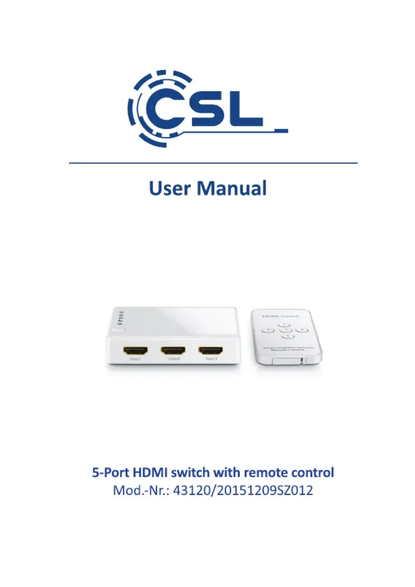 - Achage LED pour la connexion acve12 Français 3 Propriétés Avec le commutateur HDMI pour pouvez connecter 5 appareils à une interface HDMI. Le commutateur détecte la mise en marche d'un des appareils connectés et commute automaquement sur le canal correspondant. Vous pouvez aussi, en opon, commuter manuellement entre les 5 canaux avec la télécommande ou à travers de la touche sur le dessus de l'appareil. 4 Mise en service Rerez le commutateur HDMI et le récepteur infrarouge de l'emballage. Con- nectez le câble de raccord du récepteur infrarouge à la che de raccord « IR » du commutateur HDMI. Déballez ensuite la télécommande et rerez la bande séparatrice de sécurité qui dépasse du comparment à piles au dos. Éteignez tous les appareils que vous voulez connecter et connectez-les ensuite au commutateur avec un câble HDMI approprié. Aenon : Le commutateur HDMI est alimenté en courant nécessaire pour son fonconnement directement à travers du câble HDMI. À cee n des ls supplé- mentaires sont intégrés dans la norme HDMI. Les appareils construits pour le marché européen doivent, conformément à cee spécicaon, fournir une alimentaon électrique de 5 V. Certains disposifs ne sont malheureusement pas en état de fournir cee énergie ou ne transmeent pas cee tension sur le ls prévu par la norme. Pour ces cas, une connexion pour une che coaxiale (4,0 mm / 1,7 mm ; 3,5 mm / 1,35 mm ; conducteur interne : plus ; connecteur externe : moins/masse ) est installée sur le commutateur HDMI, à travers de laquelle l'appareil peut être alimenté d'une tension de 5 V. Le problème se laisse ainsi facilement résoudre, à l'aide d'un bloc d'alimentaon compable.13Français 5 Consignes de sécurité et clause de non responsabilité N’essayez jamais d’ouvrir l’appareil pour le réparer ou le modier. Évitez tout con- tact avec la tension du secteur. Ne court-circuitez pas l’appareil. L’appareil n’est pas approuvé pour une ulisaon en extérieur, ulisez-le exclusivement dans un endroit sec. Protégez-le d’un taux d’humidité élevé, de l’eau et de la neige. N’exposez pas l’appareil à des températures élevées. N’exposez pas l’appareil à des changements de température soudains ou à de fortes vibraons, car cela pourrait endommager les éléments électroniques. Vériez que l’appareil n’est pas endommagé avant de l’uliser. Ne pas uliser l’appareil s’il a subi un choc ou qu’il a été endommagé d’une quelconque autre manière. Veillez à respecter les disposions et les restricons naonales. N’ulisez pas l’appareil dans un autre but que celui indiqué dans les instrucons. Cet appareil n’est pas un jouet. Conservez-le hors de portée des enfants ou des personnes aeintes de troubles mentaux. Toute modicaon ou réparaon qui n’a pas été eectuée par le fournisseur d’origine entraîne l’annulaon de la garane et des droits de recours en garan- e.L’ulisaon de l’appareil est réservée aux personnes qui ont lu et compris les présentes instrucons. Les spécicaons de l’appareil peuvent être modiées sans nocaon préalable. 6 Indicaons de recyclage Les appareils électriques et électroniques ne doivent pas être jetés avec les or- dures ménagères, conformément à la direcve DEEE. Leurs éléments doivent être recyclés ou éliminés séparément, car une éliminaon inappropriée d’éléments toxiques et dangereux pourrait porter préjudice à l’environnement. Conformément à la loi relave aux appareils électroniques, en tant que con- sommateur, vous êtes obligé de ramener gratuitement les appareils électriques et électroniques arrivés en n de vie au fabricant, au point de vente ou dans un point de collecte prévu à cet eet. La loi de chaque pays règle les détails connex- es. Le symbole sur le produit, le manuel d’ulisaon et/ou l’emballage indique lesdites disposions. Avec ce type de séparaon des maères, de recyclage et d’éliminaon des appareils usagés, vous prenez part acvement à la protecon de notre environnement.14 Français Direcve DEEE: 2012/19/EU N° d’enregistrement DE: 94495668 Le symbole de poubelle écrasée signie qu’il est interdit de jeter la pile dans les ordures ménagères. 7 Consignes concernant le recyclage des piles En rapport avec la distribuon de baeries ou la livraison d’appareils contenant des baeries, le fournisseur est tenu d’informer le client sur les aspects suivants: Comme ulisateur nal, le client est tenu légalement de restuer les baeries us¬agées. Il peut restuer gratuitement les baeries usagées que le fournis- seur pro¬pose ou a proposé comme baeries neuves dans son assorment, à l’entrepôt d’expédion (adresse d’expédion) du fournisseur. Les symboles représentés sur les baeries ont la signicaon suivante ; Pb = la baerie conent plus de 0,004 pour cent en masse de plomb, Cd = la baerie conent plus de 0,002 pour cent en masse de cadmium, Hg = la baerie conent plus de 0,0005 pour cent en masse de mercure. Par la présente, la société CSL Computer GmbH & Co. KG déclare que l’appareil 43120/20151209SZ012 est conforme aux exigences essenelles et aux autres disposions pernentes. Pour obtenir une déclaraon de conformité dans son intégralité, contactez: CSL Computer GmbH & Co. KG, Sokelantstraße 35, 30165 HanovreNotesCSL Computer GmbH & Co. KG • Sokelantstr. 35 • D 30165 Hannover www.csl-computer.com