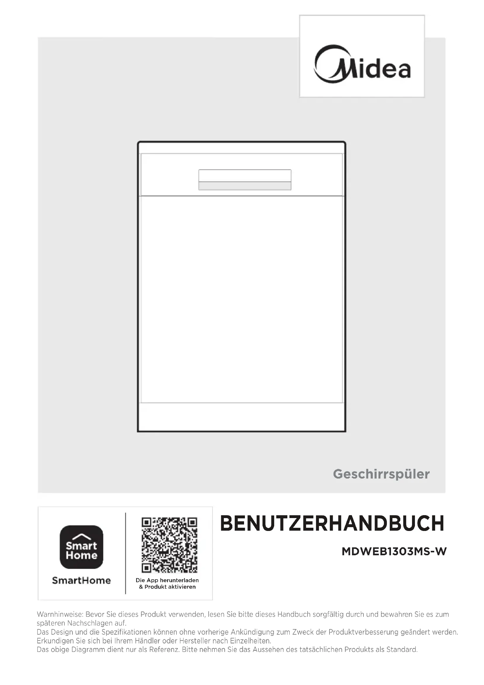 Lave-vaisselle MANUEL D’UTILISATEUR MDWEB1303MS-W Avertissement: Avant d’utiliser l’appareil, veuillez lire attentivement ce manuel et le conserver pour référence ultérieure. La conception et les spécifications sont sujettes à changement sans préavis pour l’amélioration du produit. Consultez votre revendeur ou fabricant pour plus de détails. Le schéma ci-dessus est seulement à titre indicatif. Veuillez-vous référer à l'apparence du produit réel. Télécharger l'application et activer le produitLETTRE DE REMERCIEMENT Merci d'avoir choisi Midea ! Avant d'utiliser votre nouveau produit Midea, veuillez lire attentivement ce manuel afin de vous assurer que vous savez comment utiliser les caractéristiques et fonctions de votre nouvel appareil en toute sécurité.