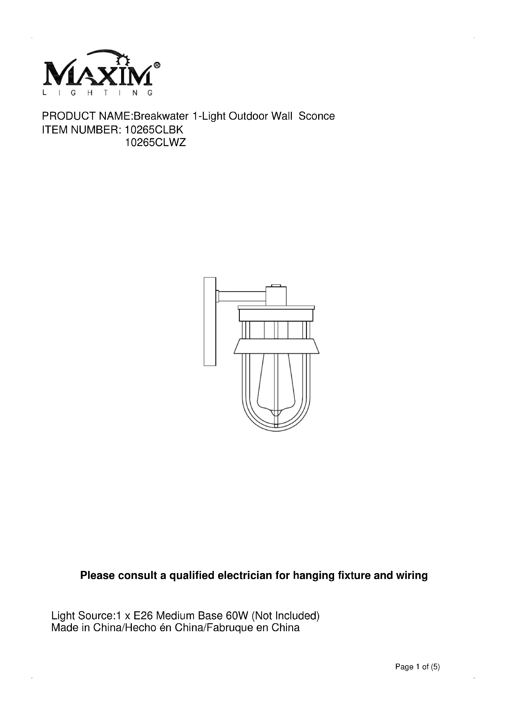 Breakwater 10265CLBK - Éclairage Maxim - Notice d'utilisation et mode d'emploi gratuit