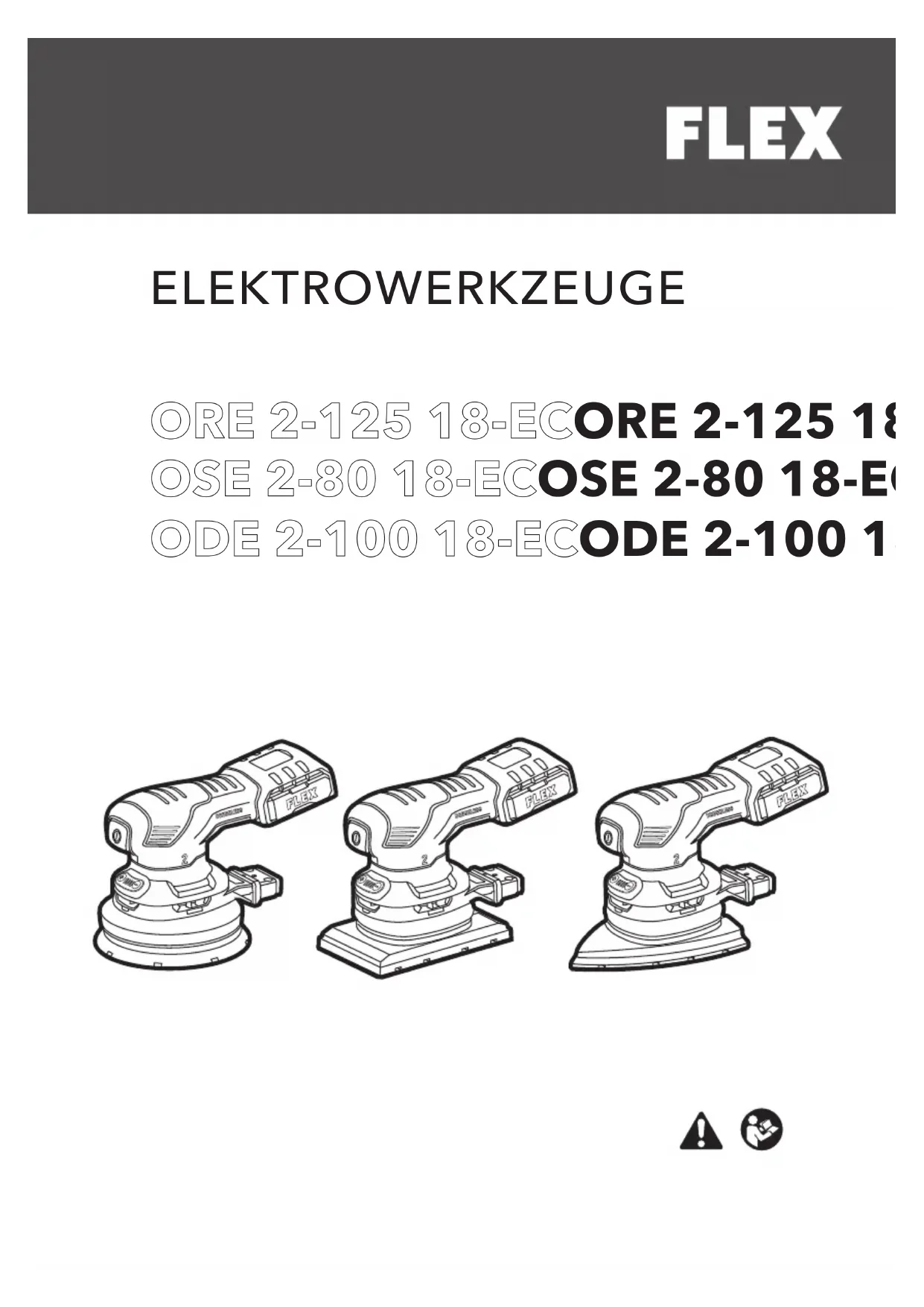 Nettoyez régulièrement l’intérieur du boîtier et le moteur avec de l’air comprimé sec. Pièces de rechange et accessoires Pour d’autres accessoires, consultez les catalogues du fabricant.Vous trouverez des dessins éclatés et des listes de pièces de rechange sur notre site internet : www.flex-tools.com Informations relatives à l’élimination des déchets AVERTISSEMENT ! Rendre inutilisables les outils électriques redondants : aen retirant la batterie dans le cas d’un outil électrique fonctionnant sur batterie. Pays de l’UE uniquementNe jetez pas les outils électriques avec les ordures ménagères !Conformément à la directive européenne 2012/19/UE relative aux déchets d'équipements électriques et électroniques et à sa transposition dans la législation nationale, les outils électriques usagés doivent être collectés séparément et recyclés dans le respect de l’environnement.Récupération des matières premières à la place de l’élimination des déchets.L’appareil, les accessoires et l’emballage doivent être recyclés dans le respect de l’environnement. Les pièces en plastique sont identifiées pour le recyclage selon le type de matériau. AVERTISSEMENT ! Ne jetez pas les batteries avec les ordures ménagères, ni dans un feu ou dans l’eau. N’ouvrez pas des batteries usagées. Pays de l’UE uniquement :Conformément à la directive 2006/66/CE, les batteries défectueuses ou usagées doivent être recyclées. REMARQUE N’hésitez pas à demander à votre revendeur des informations concernant l’élimination du produit !23 ORE 2-125 18-EC/OSE 2-80 18-EC/ODE 2-100 18-EC -Déclaration de conformité Nous déclarons sous notre seule responsabilité que le produit décrit dans les « Spécifications techniques » est conforme aux normes ou documents normatifs suivants : EN 62841 conformément aux réglementations des directives 2014/30/ UE, 2006/42/CE, 2011/65/UE. Responsable pour les documents techniques : FLEX-Elektrowerkzeuge GmbH, R & D Bahnhofstrasse 15, D-71711 Steinheim/Murr Peter Lameli Klaus Peter Weinper Directeur Chef du Service Qualité technique