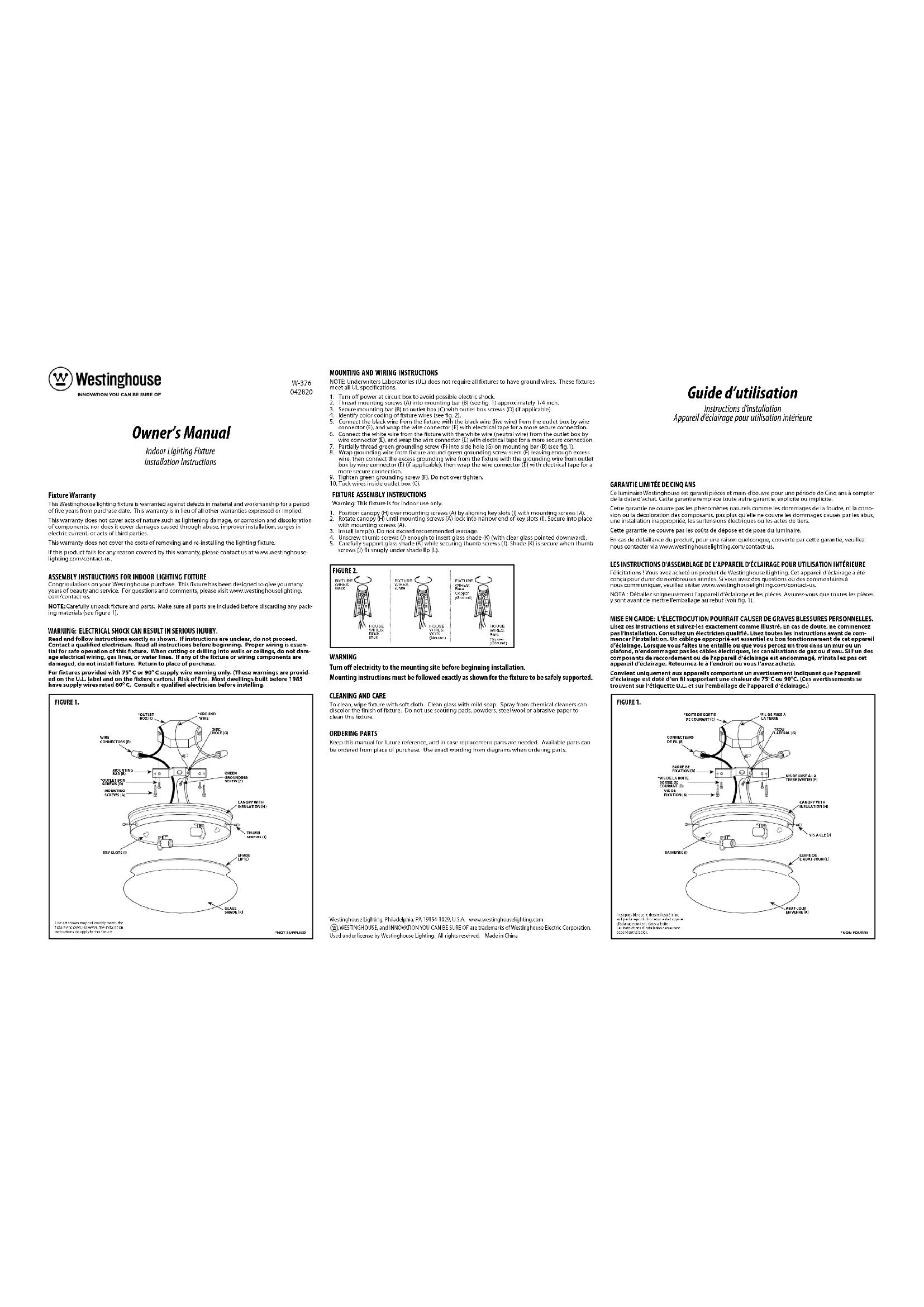 Ce luminaire Westinghouse est garanti pièces et main-d’oeuvre pour une période de Cinq ans à compter de la date d’achat. Cette garantie remplace toute autre garantie, explicite ou implicite. Cette garantie ne couvre pas les phénomènes naturels comme les dommages de la foudre, ni la corro- sion ou la décoloration des composants, pas plus qu’elle ne couvre les dommages causés par les abus, une installation inappropriée, les surtensions électriques ou les actes de tiers. Cette garantie ne couvre pas les coûts de dépose et de pose du luminaire.En cas de défaillance du produit, pour une raison quelconque, couverte par cette garantie, veuillez nous contacter via www.westinghouselighting.com/contact-us. MISE EN GARDE: L’ÉLECTROCUTION POURRAIT CAUSER DE GRAVES BLESSURES PERSONNELLES. Lisez ces instructions et suivez-les exactement comme illustré. En cas de doute, ne commencez pas l’installation. Consultez un électricien qualifié. Lisez toutes les instructions avant de com- mencer l’installation. Un câblage approprié est essentiel au bon fonctionnement de cet appareil d’éclairage. Lorsque vous faites une entaille ou que vous percez un trou dans un mur ou un plafond, n’endommagez pas les câbles électriques, les canalisations de gaz ou d’eau. Si l’un des composants de raccordement ou de l’appareil d’éclairage est endommagé, n’installez pas cet appareil d’éclairage. Retournez-le à l’endroit où vous l’avez acheté.Convient uniquement aux appareils comportant un avertissement indiquant que l’appareil d’éclairage est doté d’un fil supportant une chaleur de 75°C ou 90°C. (Ces avertissements se trouvent sur l’étiquette U.L. et sur l’emballage de l’appareil d’éclairage.)INSTRUCTIONS D’ASSEMBLAGE DE L’APPAREIL D’ÉCLAIRAGE Mise en Garde: À utiliser à l’intérieur seulement.