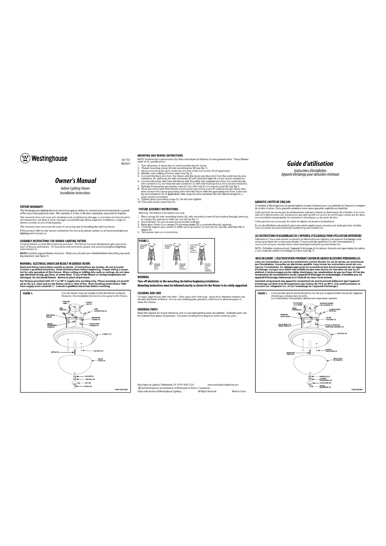 Ce luminaire Westinghouse est garanti pièces et main-d’oeuvre pour une période de Cinq ans à compter de la date d’achat. Cette garantie remplace toute autre garantie, explicite ou implicite. Cette garantie ne couvre pas les phénomènes naturels comme les dommages de la foudre, ni la corro- sion ou la décoloration des composants, pas plus qu’elle ne couvre les dommages causés par les abus, une installation inappropriée, les surtensions électriques ou les actes de tiers. Cette garantie ne couvre pas les coûts de dépose et de pose du luminaire.En cas de défaillance du produit, pour une raison quelconque, couverte par cette garantie, veuillez nous contacter via www.westinghouselighting.com/contact-us. MISE EN GARDE: L’ÉLECTROCUTION POURRAIT CAUSER DE GRAVES BLESSURES PERSONNELLES. Lisez ces instructions et suivez-les exactement comme illustré. En cas de doute, ne commencez pas l’installation. Consultez un électricien qualifié. Lisez toutes les instructions avant de com- mencer l’installation. Un câblage approprié est essentiel au bon fonctionnement de cet appareil d’éclairage. Lorsque vous faites une entaille ou que vous percez un trou dans un mur ou un plafond, n’endommagez pas les câbles électriques, les canalisations de gaz ou d’eau. Si l’un des composants de raccordement ou de l’appareil d’éclairage est endommagé, n’installez pas cet appareil d’éclairage. Retournez-le à l’endroit où vous l’avez acheté.Convient uniquement aux appareils comportant un avertissement indiquant que l’appareil d’éclairage est doté d’un fil supportant une chaleur de 75°C ou 90°C. (Ces avertissements se trouvent sur l’étiquette U.L. et sur l’emballage de l’appareil d’éclairage.)Line art shown may not exactly match the fixture enclosed. However, the installation instructions do apply to this fixture.Westinghouse Lighting, Philadelphia, PA 19154-1029, U.S.A. www.westinghouselighting.com and Westinghouse are trademarks of Westinghouse Electric Corporation. Used under license by Westinghouse Lighting. All Rights Reserved. Made in ChinaINSTRUCTIONS D’ASSEMBLAGE DE L’APPAREIL D’ÉCLAIRAGE Mise en Garde: À utiliser à l’intérieur seulement.