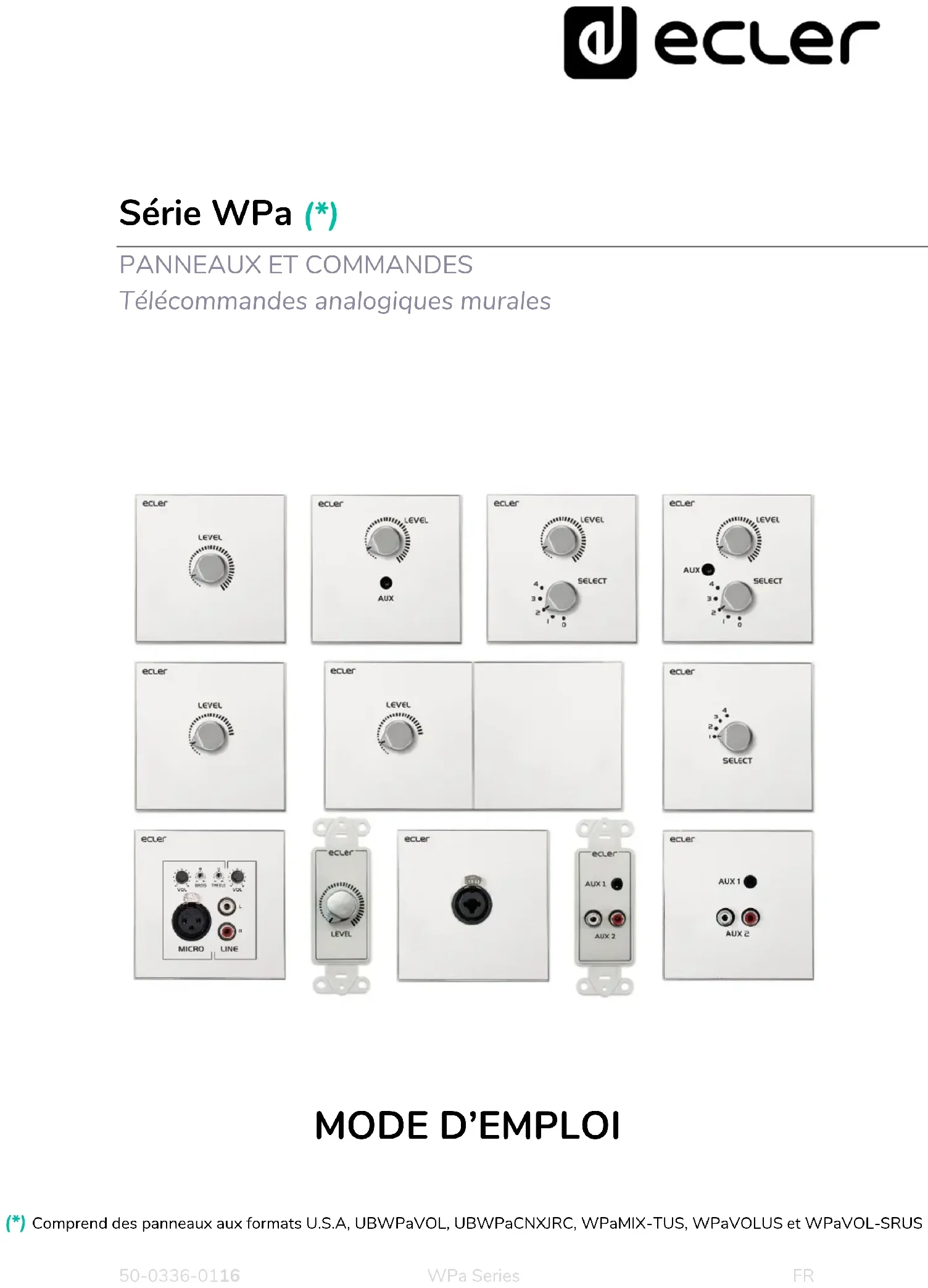 que déchet urbain non sélectionné. Allez au centre de traitement des déchets électriques et électroniques le plus proche. NEEC AUDIO BARCELONA, S.L décline toute responsabilité pour les dommages qui pourraient être causés à des personnes, des animaux ou des objets par le non-respect des avertissements ci-dessus.5 NOTE IMPORTANTE Merci d'avoir choisi notre Télécommandes analogiques mural WPa. Il est TRÈS IMPORTANT de lire attentivement ce mode d’emploi et d'en comprendre parfaitement le contenu avant d’effectuer toute connexion afin de maximiser votre utilisation et de tirer les meilleures performances de cet équipement. Pour garantir le bon fonctionnement de cet appareil, nous recommandons que sa maintenance soit assurée par nos services techniques agréés. Tous les produits ECLER bénéficient de garantie, veuillez-vous référer sur www.ecler.com ou la carte de garantie incluse avec cet appareil pour la période de validité et ses conditions. INTRODUCTION La série WPa est une gamme de panneaux muraux pour la télécommande d’équipements et l’interconnexion de signaux audio. Elle marque une évolution par rapport à son aînée, la série WPm, avec une esthétique au goût du jour, élégante et discrète, conçue en collaboration avec Italdesign Giugiaro. Un boîtier d'installation en saillie est fourni avec tous les modèles de la série WPa.6 COMMANDES DE VOLUME / SÉLECTION DE SOURCE