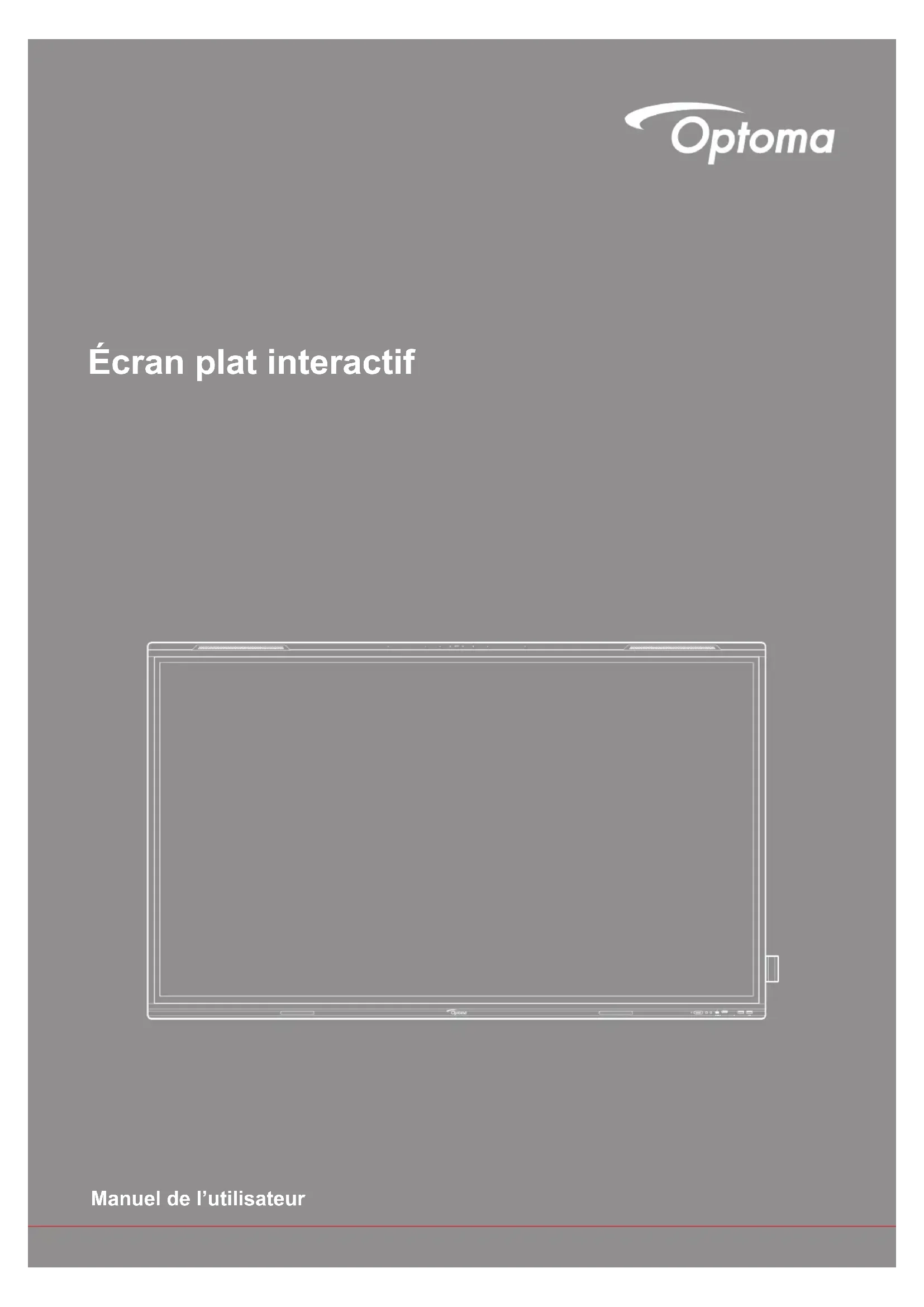 INTRODUCTION Contenu de la boîte Déballez avec précaution et vériez que vous avez les éléments suivants en plus des accessoires standard. Certains des éléments pour des accessoires en option peuvent ne pas être disponibles en fonction du modèle, de la spécication et de votre région d'achat. Consultez votre point de vente à ce sujet. Certains accessoires peuvent varier d'une région à l'autre. La carte de garantie n'est fournie que dans certaines régions. Consultez votre revendeur pour plus d'informations. Accessoires standard Câble tactile USB Câble HDMI Stylet tactile (x2) Télécommande Piles (pour la télécommande) Porte-stylet à ouverture rapide Guide de démarrage rapide *The product images shown are for illustration purposes only and may not be an exact representation of the product.Optoma reserves the right to change product images and specifications at any time without notice.InteractiveFlatBasic User ManualPanelFor detailed instructions, please scan the QR code or visit the URL:https://www.optoma.com/support/downloadINHDMI 4 3.0 3.0 Cordon d’alimentation Europe Écran plat interactif IN HDMI 4 3.0 3.0 Cordon d’alimentation Royaume-Uni Cordon d’alimentation États-Unis Câble USB-C Remarque : Pour les informations sur la garantie, rendez-vous sur le site www.optoma.com.Français