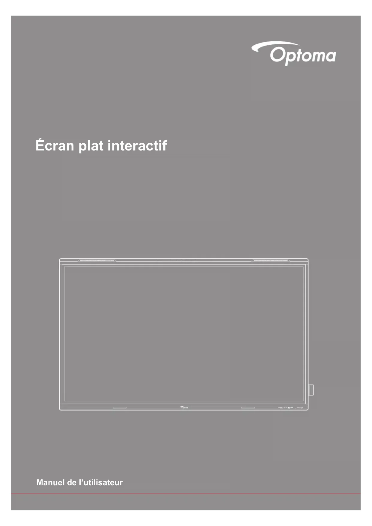 INTRODUCTION Contenu de la boîte Déballez avec précaution et vériez que vous avez les éléments suivants en plus des accessoires standard. Certains des éléments pour des accessoires en option peuvent ne pas être disponibles en fonction du modèle, de la spécication et de votre région d'achat. Consultez votre point de vente à ce sujet. Certains accessoires peuvent varier d'une région à l'autre. La carte de garantie n'est fournie que dans certaines régions. Consultez votre revendeur pour plus d'informations. Accessoires standard Câble tactile USB Câble HDMI Stylet tactile (x2) Télécommande Piles (pour la télécommande) Porte-stylet à ouverture rapide Guide de démarrage rapide *The product images shown are for illustration purposes only and may not be an exact representation of the product.Optoma reserves the right to change product images and specifications at any time without notice.InteractiveFlatBasic User ManualPanelFor detailed instructions, please scan the QR code or visit the URL:https://www.optoma.com/support/downloadINHDMI 4 3.0 3.0 Cordon d’alimentation Europe Écran plat interactif IN HDMI 4 3.0 3.0 Cordon d’alimentation Royaume-Uni Cordon d’alimentation États-Unis Câble USB-C Remarque : Pour les informations sur la garantie, rendez-vous sur le site www.optoma.com.Français