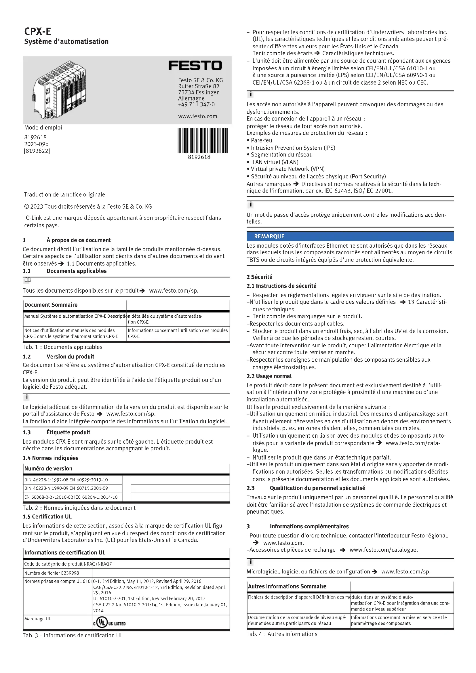 Informations complémentaires – Pour toute question d'ordre technique, contacter l'interlocuteur Festo régional.