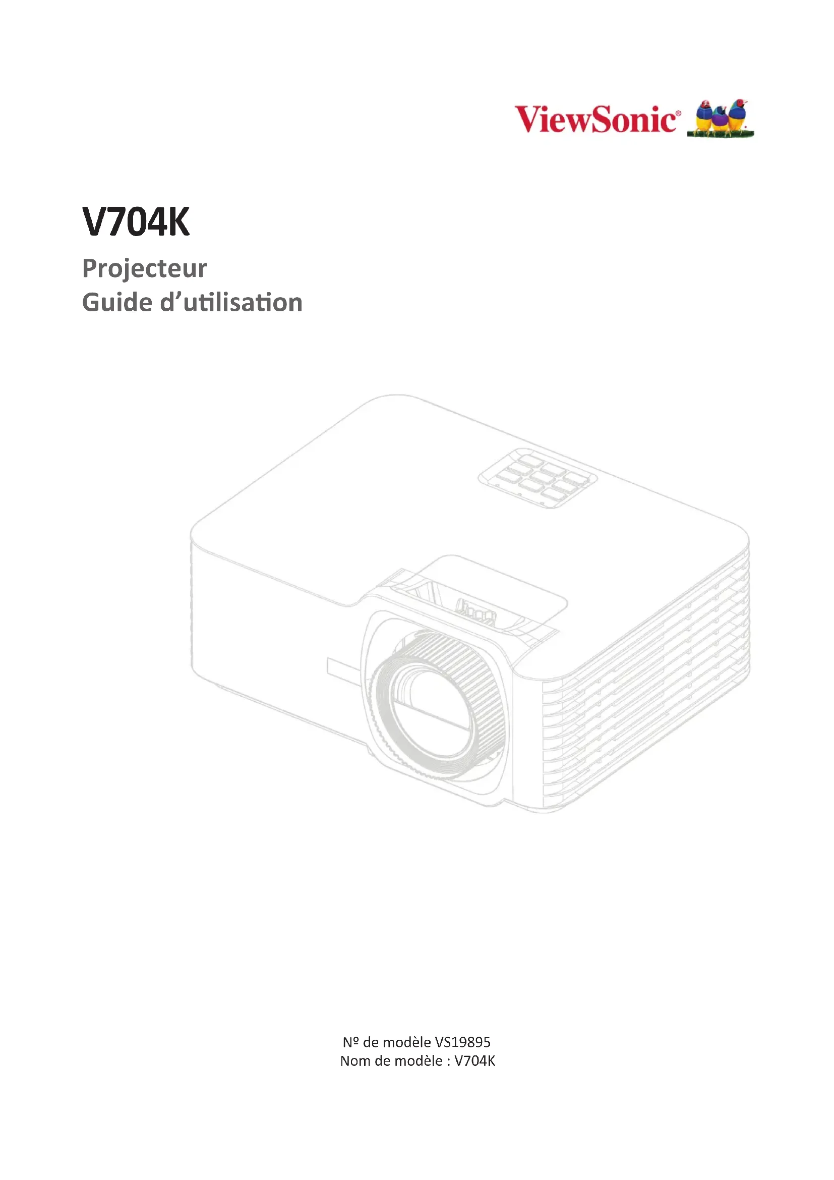 V704K Projecteur Guide d’ulisaon Nº de modèle VS19895 Nom de modèle : V704KMerci d’avoir choisi ViewSonic® ViewSonic®, un des principaux fournisseurs mondiaux de soluons visuelles, s’engage à dépasser les aentes du monde en maère d’évoluon technologique, d’innovaon et de simplicité. Chez ViewSonic®, nous pensons que nos produits peuvent avoir un impact posif dans le monde et nous sommes convaincus que le produit ViewSonic® que vous avez choisi vous sera ule. Encore une fois, merci d’avoir choisi ViewSonic® !3 Précautions de sécurité - Général Veuillez lire les Précautions de sécurité suivantes avant de commencer à utiliser le projecteur.