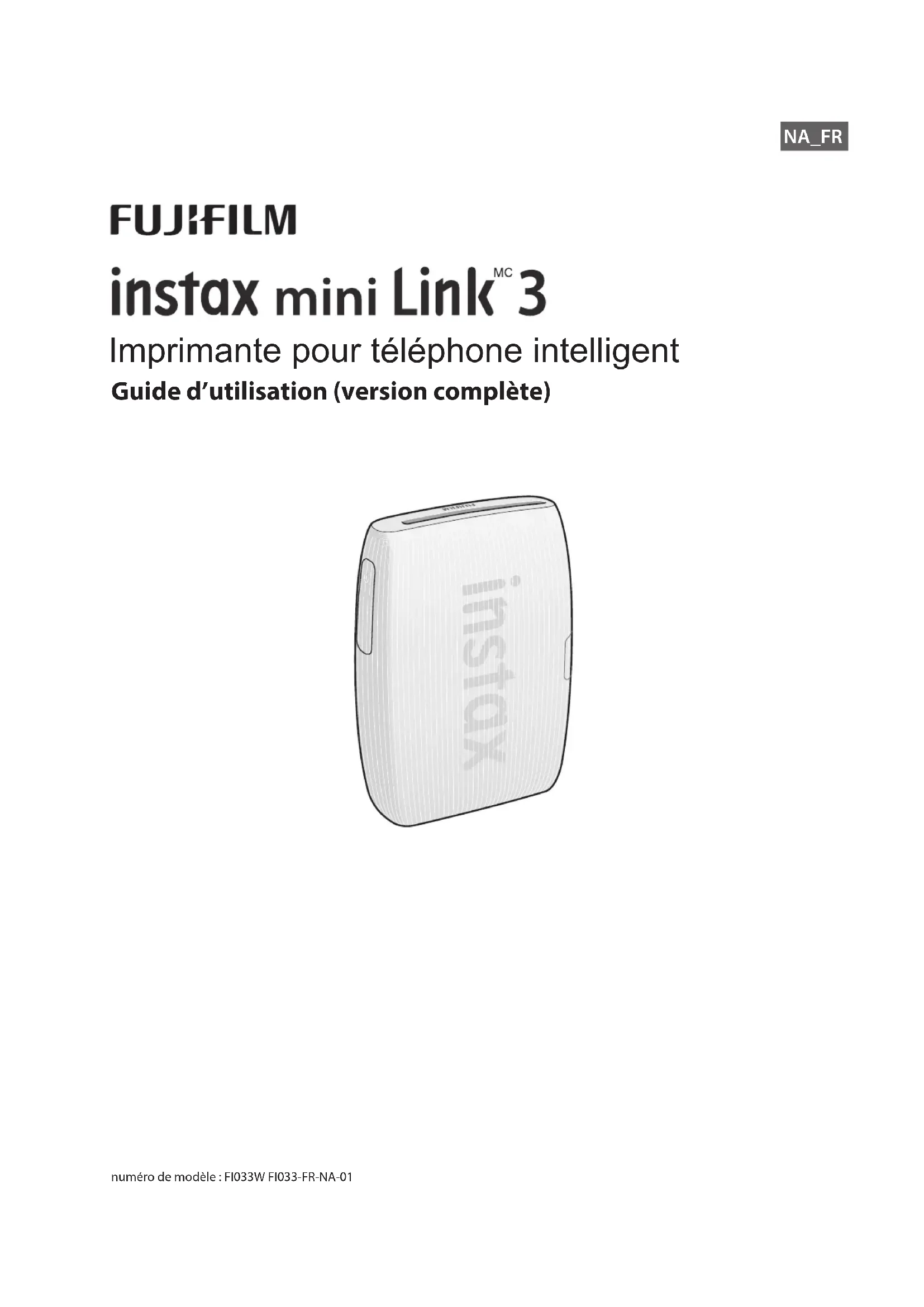 Guide d’utilisation (version complète) NA_FR Imprimante pour téléphone intelligent numéro de modèle : FI033W FI033-FR-NA-012 Table des matières Avant l’utilisation 3 Remarques sur la mise au rebut de l’imprimante 3 Nom des pièces 3 Téléchargement de l’application INSTAX MINI LINK gratuite sur votre téléphone 4 Charge de la batterie 4 Témoin DEL d'état de charge 4 Vérification du niveau de charge de la batterie5 Chargement de la cassette de films instantanés INSTAX MINI
