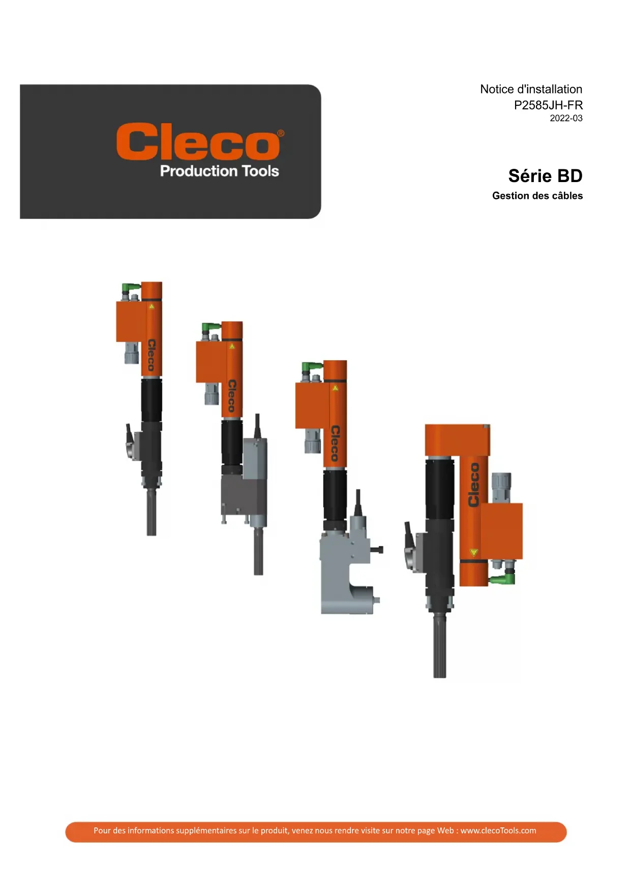 Gestion des câbles2 P2585JH | 2022-03 Apex Tool Group Copyright © Apex Tool Group, 2022 Sans l'autorisation expresse de Apex Tool Group, ce document ne peut être ni dupliqué, ni transposé par- tiellement ou entièrement sur un autre support de données ou dans une autre langue naturelle ou exploi- table par une machine ; ceci sous aucune forme - qu'il s'agisse de procédés électroniques, mécaniques, optiques ou autres. Clause de non-responsabilité Apex Tool Group se réserve le droit de modifier, compléter ou améliorer ce document ou le produit, même sans avertissement préalable. Marque Cleco Production Tools est une marque déposée de Apex Brands, Inc. Apex Tool Group 670 Industrial Drive Lexington, SC 29072 USA Fabricant Apex Tool Group GmbH Industriestraße 1 73463 Westhausen AllemagneSommaire