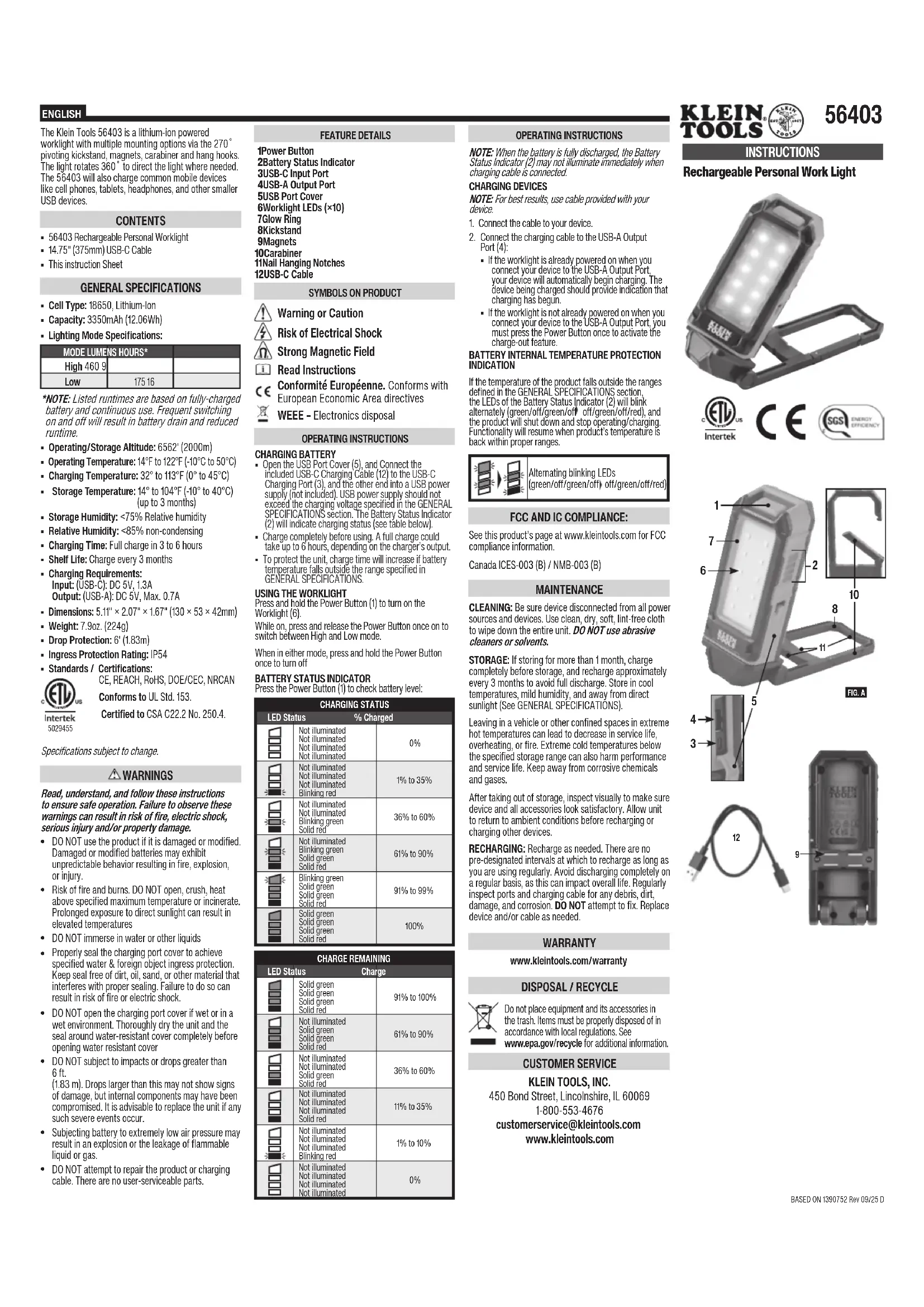 KLEINTOOLS, INC. 450Bond Street, Lincolnshire, IL60069 1800553-4676 customerservice@kleintools.com www.kleintools.com La lampe de travail avec batterie au lithium-ion56403 de KleinTools peut être posée sur sa béquille pivotant à 270° ou être accrochée grâce aux aimants, au mousqueton ou aux crochets. Elle pivote à 360° pour orienter l’éclairage là où c’est nécessaire. Elle peut aussi charger la plupart des téléphones mobiles, tablettes, écouteurs et autres petits appareils USB. CONTENU