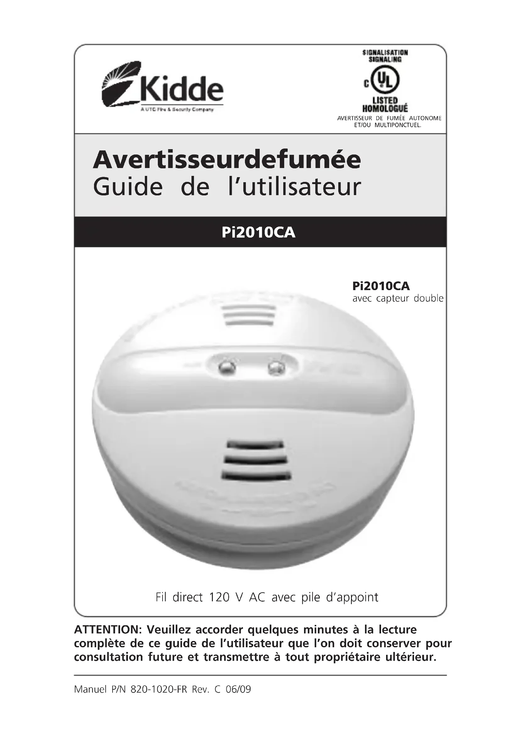 Manuel P/N 820-1020-FR Rev. C 06/09 ATTENTION: Veuillez accorder quelques minutes à la lecture complète de ce guide de l’utilisateur que l’on doit conserver pour consultation future et transmettre à tout propriétaire ultérieur. Avertisseur de fumée Guide de l’utilisateur Pi2010CA avec capteur double Pi2010CA Fil direct 120 V AC avec pile d’appoint