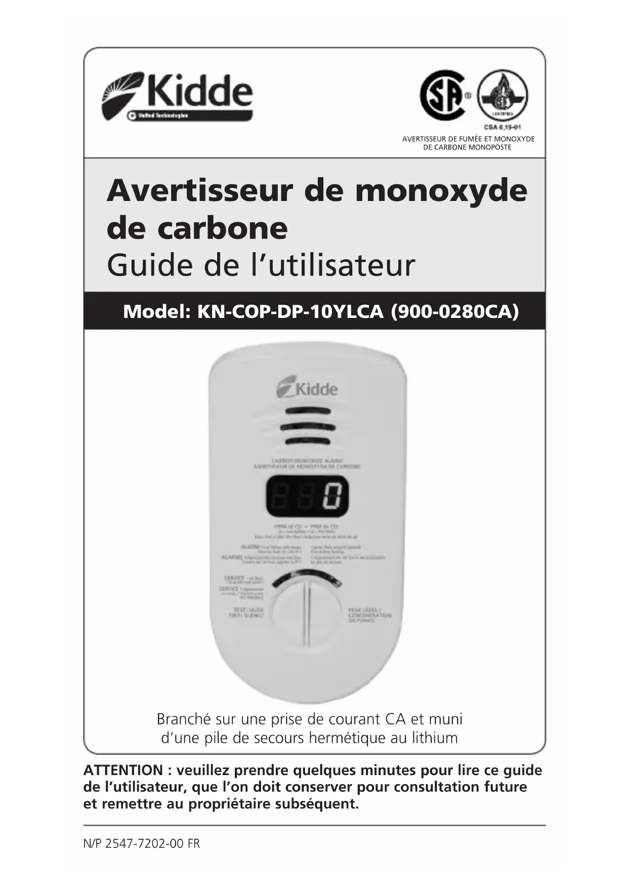 - En outre, la plupart des aérosols, produits à base d’alcool, peintures, diluants à peinture, solvants, adhésifs, laques pour cheveux, lotions après-rasage, parfums, gaz d’échappement d’auto (démarrage à froid) et certains produits de nettoyage.Garantie limitée de dix ans Si, après avoir lu ce guide de l’utilisateur, vous pensez que votre avertisseur est défectueux, n’effectuez aucune intervention dessus. Dans plusieurs cas, le moyen le plus rapide d’échanger votre avertisseur consiste à le retourner là où vous l’avez acheté. Autrement, vous pouvez le retourner chez Kidde pour réparation. Pour toute question, appelez le Service à la clientèle Kidde au 1-800-880-6788. Kidde garantit l’avertisseur fourni contre les défauts de fabrication et de main-d’œuvre ou de conception, dans des conditions normales d’utilisation et d’entretien, durant une période de 10 ans à compter de la date d’achat. L’obligation de Kidde en vertu de cette garantie se limite à la réparation ou au remplacement de l’avertisseur ou d’une pièce que nous jugeons défectueux en ce qui a trait aux matériaux, à la fabrication ou à la conception, sans frais, sur envoi de l’avertisseur avec une preuve de la date d’achat, les frais de poste étant prépayés aller et retour, à : Kidde Canada Inc., P.O. Box 40, Apsley, ON K0L 1A0. Cette garantie ne s’applique pas si l’avertisseur a été endommagé, modifié, utilisé de manière abusive ou dégradé après la date d’achat ou s’il ne fonctionne pas par suite d’un mauvais entretien ou à cause d’une alimentation électrique CA inadéquate. Toute garantie implicite découlant de cette vente, y compris, à titre non limitatif, les garanties implicites de description, de qualité marchande et d’adaptation à un usage particulier ne peuvent excéder la durée de la période de garantie mentionnée ci-dessus. Le fabricant ne devra en aucun cas être tenu responsable d’une perte d’usage de ce produit, ni de dommages directs, indirects, particuliers ou consécutifs, ou de frais engagés par le consommateur ou tout autre utilisateur de ce produit, qu’il s’agisse d’une rupture de contrat, d’une négligence, d’une responsabilité civile délictuelle stricte ou autrement. Le fabricant décline toute responsabilité à l’égard de blessures physiques, de dommages aux biens et de tous les autres dommages indirects, spéciaux, fortuits, consécutifs ou autres résultant d’une fuite de gaz, de la fumée, d’un incendie ou d’une explosion. Du fait que certaines provinces ne permettent pas de limitations sur la durée d’une garantie implicite ou les exclusions ou limitations relatives à des dommages accessoires ou indirects, les limitations ou exclusions ci-dessus peuvent ne pas s’appliquer dans votre cas. Bien que cette garantie vous donne des droits spécifiques, il se peut que vous puissiez bénéficier d’autres droits variant selon les provinces. La garantie ci-dessus ne peut être modifiée que par écrit, avec la signature des deux parties concernées. IMPORTANT : ne pas retirer le couvercle arrière de l’appareil. En effet, le retrait du couvercle arrière entraîne l’annulation pure et simple de la garantie. Votre avertisseur de monoxyde de carbone Kidde ne remplace pas une assurance sur les biens, le feu, l’invalidité, la vie ou toute autre forme d’assurance. Il est de votre responsabilité de prendre une couverture d’assurance appropriée. Consultez votre agent d’assurance. Kidde Canada Inc., P.O. Box 40, Apsley, ON K0L1A0
