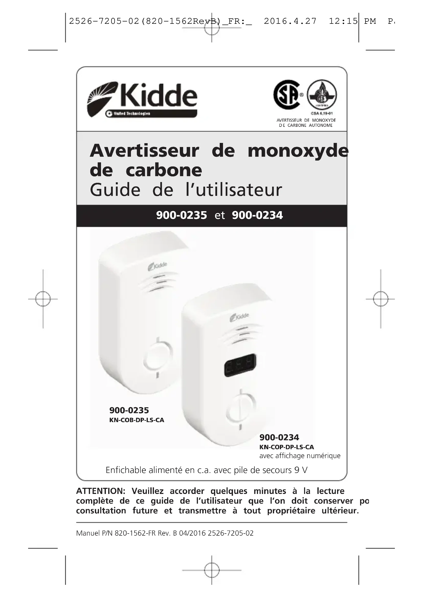 Manuel P/N 820-1562-FR Rev. B 04/2016 2526-7205-02 ATTENTION: Veuillez accorder quelques minutes à la lecture complète de ce guide de l’utilisateur que l’on doit conserver pour consultation future et transmettre à tout propriétaire ultérieur. Avertisseur de monoxyde de carbone Guide de l’utilisateur 900-0235 et 900-0234 KN-COB-DP-LS-CA