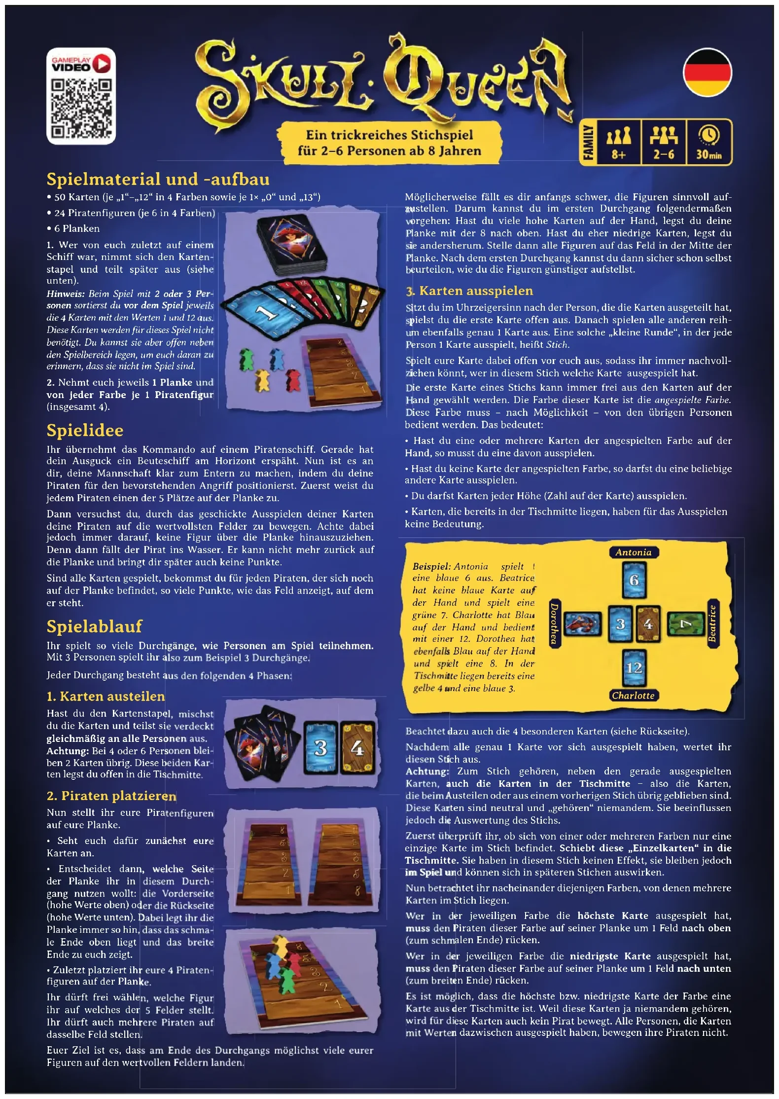 en jouant à 4 ou 6 per- sonnes il reste 2 cartes. Posez-les au . Placer les pirates lacez à présent vos pirates sur la planche. Pour cela, chaque personne : regarde d’abord ses cartes. Soyez attentif aux 4 cartes spéciales (voir au dos). Dès que vous avez tous joué 1 carte, évaluez ce pli. Attention : mais aussi les cartes au centre de la zone de jeu en trop pendant la distribution ainsi que les cartes restantes du pli pré- cédent. Ces cartes sont neutres et considérées comme n’ayant été jouées par personne, mais ont une influence sur l’évaluation du pli. et joue donc un 12 bleu. Dorothée a également une carte bleue et joue donc un 8 bleu. Au centre de la table se trouvent un 4 jaune et un 3 bleu. lacez à présent vos pirates sur la planche. Pour cela, chaque personne : 2 à 6 pirates de 10 ans et plus Un jeu de pli malin pour• Second de la capitaine Cette carte a la valeur 13 et prend la même cou- leur que la couleur annoncée lorsqu’elle est jouée. Vous pouvez donc jouer cette carte dans n’impor- te quel pli, peu importe la couleur annoncée et si vous avez cette couleur en main ou non. Si cette carte est la première carte d’un pli, c’est la carte suivante qui détermine la couleur annoncée. Le second de la capitaine est la carte de valeur la plus élevée dans la couleur qu’elle a prise. Vous devrez donc dans tous les cas déplacer votre pirate vers le haut. Après avoir évalué le pli, posez toutes les cartes que vous n’avez pas déplacées au centre en une pile face cachée sur le côté de la zone de jeu. La personne ayant joué au pli précédent la carte de la valeur la plus élevée, peu importe la couleur, joue la première carte du nouveau pli. En cas d‘égalité, c‘est la personne ayant posé en dernier la carte la plus élevée du pli qui commence. Répétez cela jusqu’à ce que vous ayez joué toutes les cartes de votre main. Cette manche est alors terminée et vous passez au comptage.