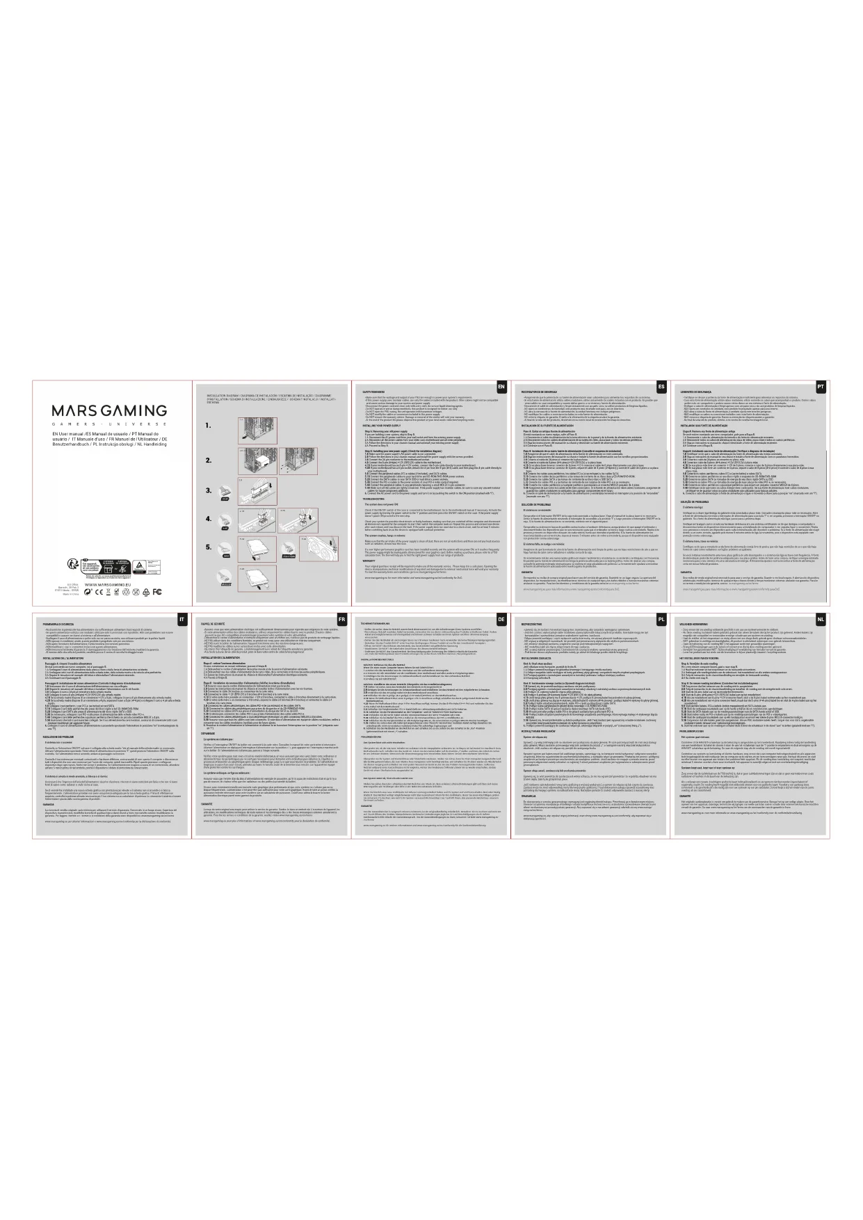 Étape A : retirez l'ancienne alimentation Si vous construisez un nouvel ordinateur, passez à l'étape B. 1.A Débranchez le cordon d'alimentation de la prise murale et de la source d'alimentation existante. 2.A Débranchez tous les câbles d'alimentation de la carte vidéo, de la carte mère et de tous les autres périphériques. 3.A Suivez les instructions du manuel du châssis et désinstallez l'alimentation électrique existante. 4.A Passez à l'étape B. Étape B : Installation du nouveau bloc d'alimentation (Vérifiez le schéma d'installation) 1.B Assurez-vous que le cordon d'alimentation de l'alimentation n'est pas branché. 2.B Suivez les instructions du manuel du châssis et installez le bloc d'alimentation avec les vis fournies. 3.B Connectez le câble 24 broches au connecteur de la carte mère. 4.B Connectez le câble +12V (EPS12V) à 8 broches (4+4 broches) à la carte mère. 4.1B Si votre carte mère possède un connecteur +12V à 8 broches, connectez le câble à 8 broches directement à la carte mère. 4.2B Si votre carte mère a un connecteur à 4 broches, séparez le câble à 8 broches (4+4 broches) et connectez le câble à 4 broches à la carte mère. 5.B Connectez les câbles périphériques, les câbles PCI-e (le cas échéant) et les câbles SATA. 5.1B Connectez les câbles des périphériques aux prises du disque dur et du CD-ROM/DVD-ROM. 5.2B Connectez les câbles SATA aux prises d'alimentation du disque dur SATA ou du SSD. 5.3B Si nécessaire, connectez les câbles PCI-e aux prises d'alimentation des cartes vidéo PCI-e. 5.4B Connectez les câbles périphériques à tout périphérique nécessitant un petit connecteur MOLEX à 4 broches. 5.5B Assurez-vous que tous les câbles sont bien connectés. Si votre bloc d'alimentation est équipé de câbles modulaires, veillez à conserver tous les câbles modulaires inutilisés pour de futurs ajouts. 6. Branchez le cordon d'alimentation à l'alimentation et allumez-le en basculant l'interrupteur sur la position "on" (étiquetée avec un "I"). DÉPANNAGE Le système ne s'allume pas : Vérifiez si l'interrupteur ON/OFF du boîtier est connecté à la carte mère. Consultez le manuel de votre carte mère si nécessaire. Allumez l'alimentation en déplaçant l'interrupteur d'alimentation sur la position « I », puis appuyez sur l'interrupteur marche/arrêt sur le boîtier. Si l'alimentation ne s'allume pas, passez à l'étape suivante. Vérifiez votre système pour tout court-circuit ou matériel défectueux, en vous assurant que vous avez éteint votre ordinateur et déconnecté tous les périphériques qui ne sont pas nécessaires pour démarrer votre ordinateur, puis rallumez-le. Répétez ce processus et branchez un périphérique après chaque redémarrage jusqu'à ce que vous trouviez le problème. Si l'alimentation ne réagit pas à cause d'un court-circuit, attendez au moins 5 minutes avant de la remettre sous tension, car l'appareil est équipé d'une protection contre les surcharges. Le système se bloque, se fige ou redémarre : Assurez-vous que l'entrée d'air du bloc d'alimentation est exempte de poussière, qu'il n'y a pas de restrictions d'air et qu'il n'y a pas de sources de chaleur telles que des radiateurs ou des poêles à proximité du boîtier. Si vous avez récemment installé une nouvelle carte graphique plus performante et que votre système ne s'allume pas ou se bloque fréquemment. L'alimentation n'est peut-être pas suffisante pour votre carte graphique. Avant de faire un achat, vérifiez la puissance estimée nécessaire pour votre système sur un calculateur de puissance. L'outil vous aidera à trouver la bonne alimentation électrique parmi notre gamme de produits. GARANTIE Le reçu de vente original sera requis pour utiliser le service de garantie. Gardez-le dans un endroit sûr. L'ouverture de l'appareil, les altérations, les modifications techniques de toute nature et les dommages dus à des forces mécaniques externes annuleront la garantie. Pour lire les termes et conditions de la garantie, veuillez visiter www.marsgaming.eu/en/terms www.marsgaming.eu pour plus d'informations et www.marsgaming.eu/en/conformity pour la déclaration de conformité. SICHERHEITSERINNERUNG -Stellen Sie sicher, dass Ihr Netzteil ausreichend dimensioniert ist, um die Anforderungen Ihres Systems zu erfüllen. -Wenn dieses Netzteil modulare Kabel verwendet, verwenden Sie nur die im Lieferumfang des Produkts enthaltenen Kabel. Andere Kabel sind möglicherweise nicht kompatibel und können schwere Schäden an Ihrem System und Ihrer Stromversorgung verursachen. -Ziehen Sie das Netzkabel ab und reinigen Sie es nur mit einem trockenen Tuch, verwenden Sie keine flüssigen Reinigungsmittel. - Betreiben Sie das Produkt NICHT unter feuchten Bedingungen. Dieses Produkt ist nur für den Innenbereich konzipiert. -Öffnen Sie NICHT das Gehäuse des Netzteils, das Gerät arbeitet mit gefährlicher Spannung. - Modifizieren Sie NICHT die Kabel oder Anschlüsse, die diesem Netzteil beiliegen. - Entfernen Sie NICHT das Garantieetikett. Bei Beschädigung oder Entfernung des Etiketts erlischt die Garantie. - Am Ende der Nutzungsdauer des Produkts entsorgen Sie es bei Ihrem örtlichen Sammel-/Recyclingzentrum.