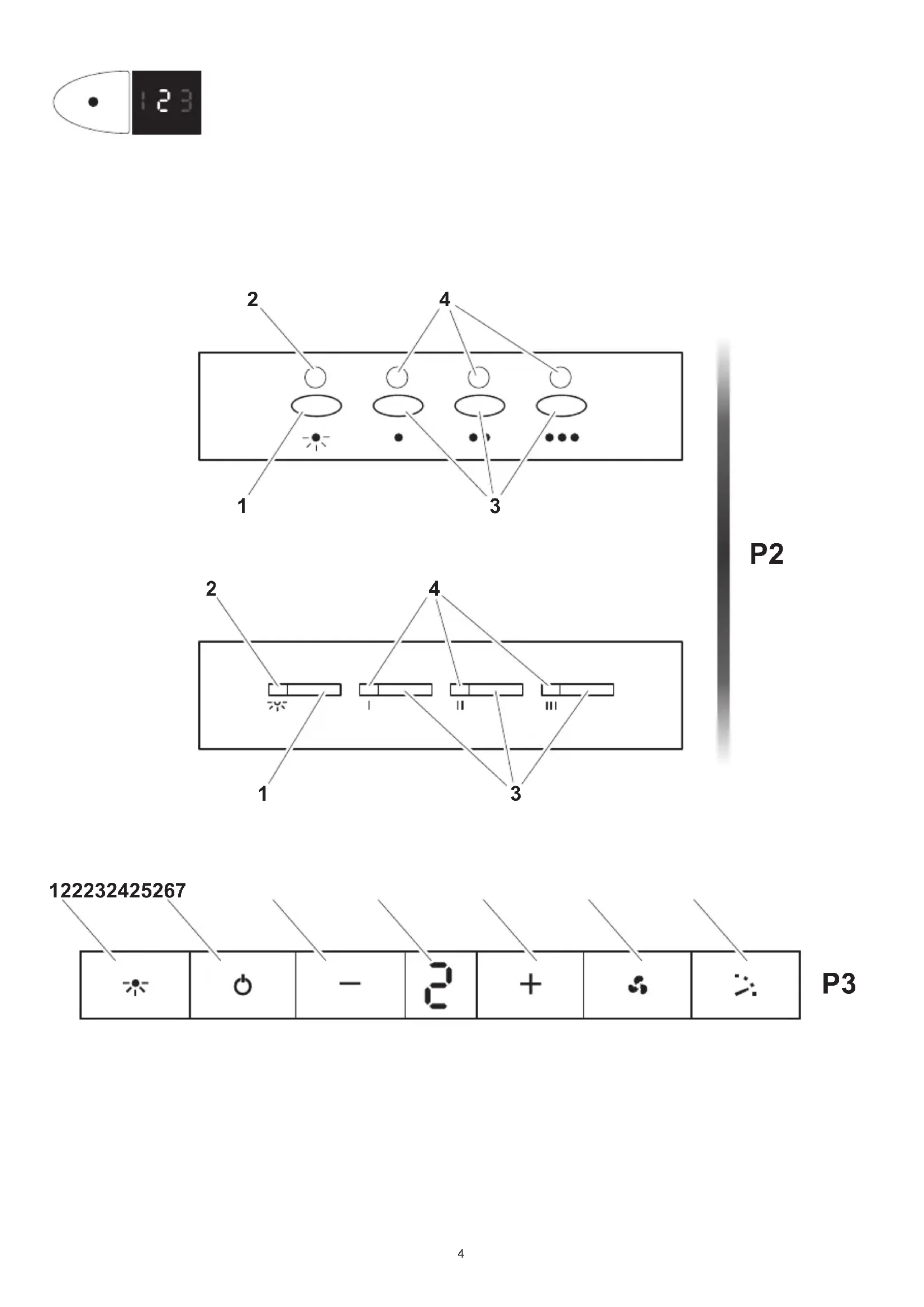 Minuterie : maintenez appuyée pendant deux secondes la touche de la vitesse choisie, jusqu’à ce que l’indicateur clignote. 15 min plus tard, l’extracteur s’arrête et l’éclairage s’éteint. Pour annuler la minuterie: appuyez une fois sur la touche de la vitesse choisie. Pupitre à quatre vitesses - Afcheur numérique (illustration P3)