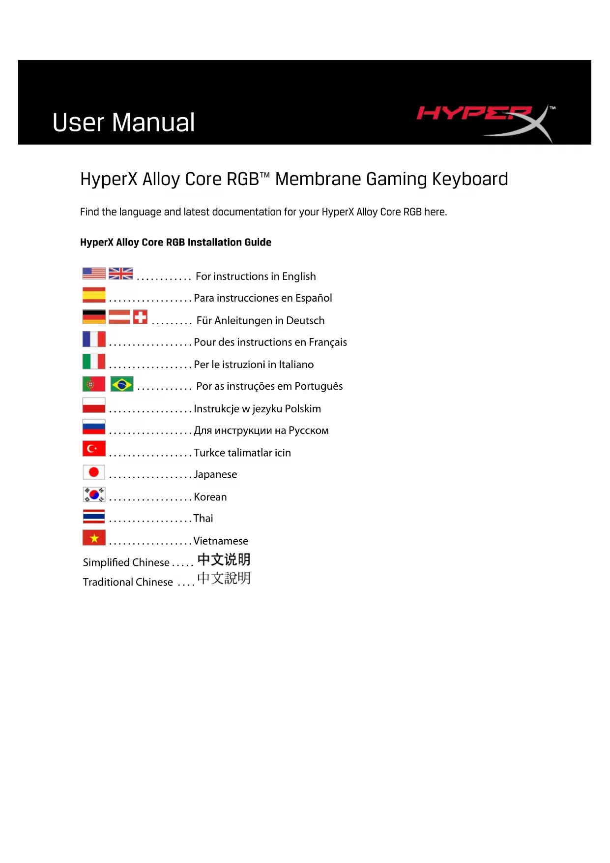 Retrouvez gratuitement la notice de l'appareil HyperX Alloy Core RGB HP au format PDF.